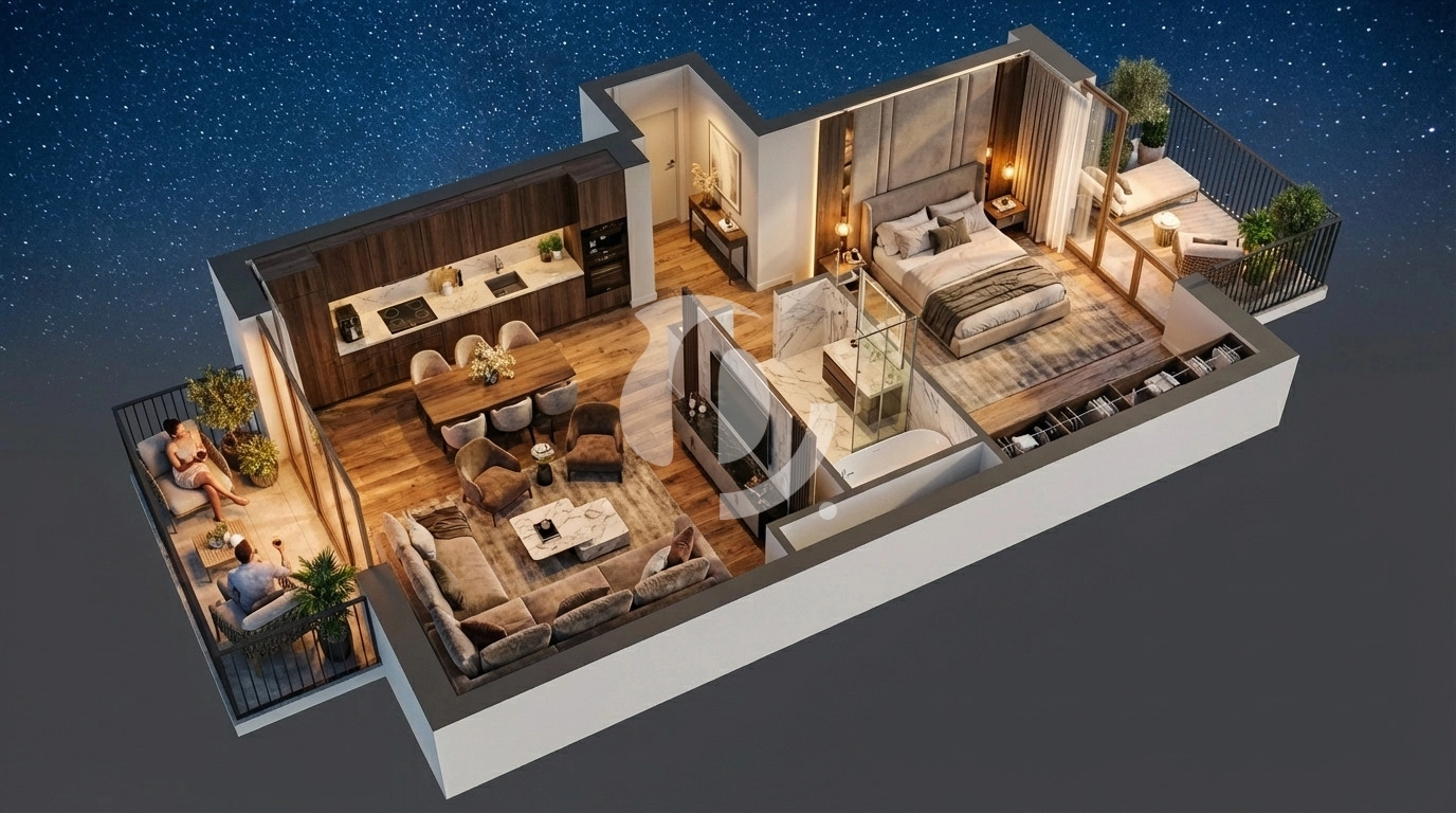 Rzut oraz wizualizacje przedstawiają przykładowy sposób aranżacji wnętrza.
