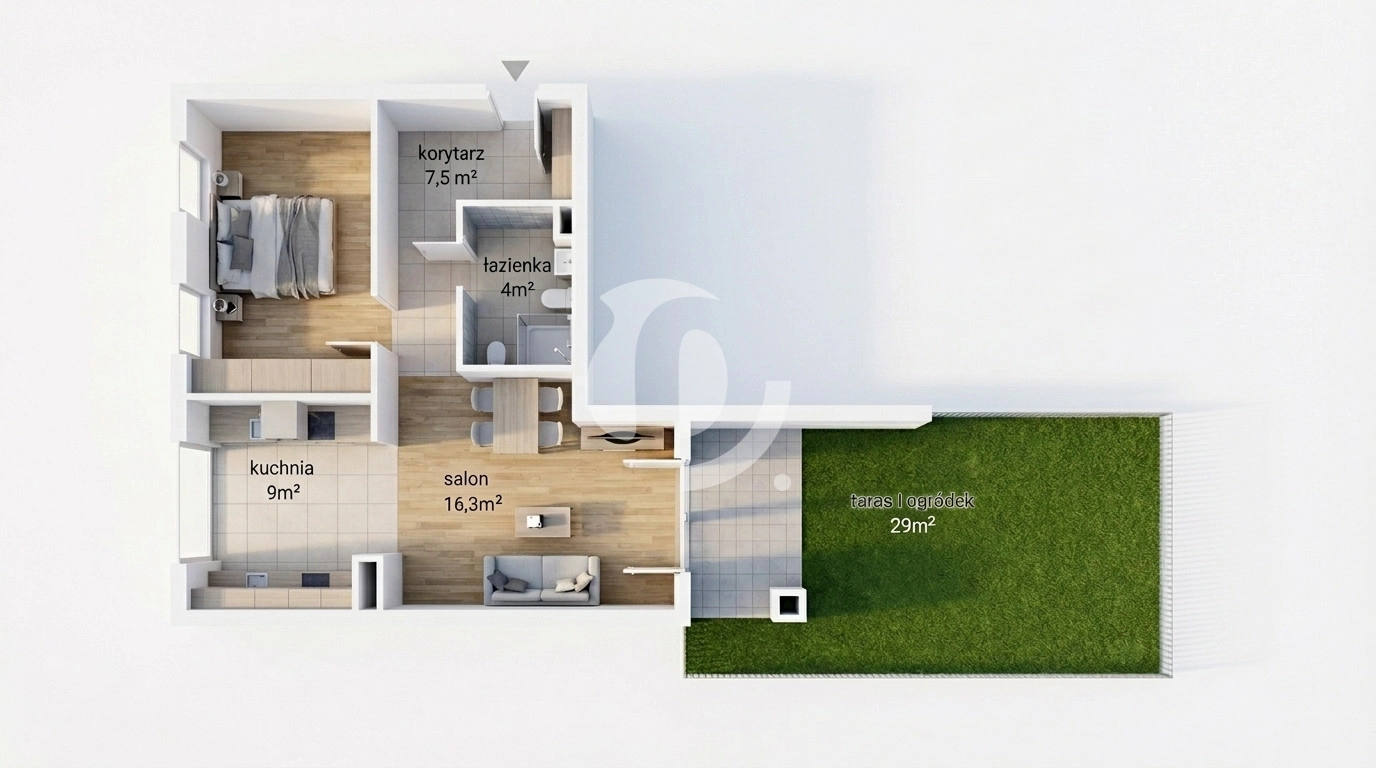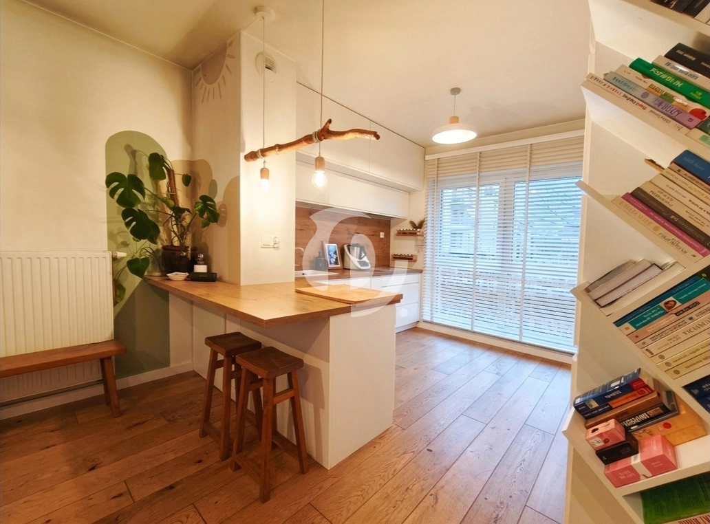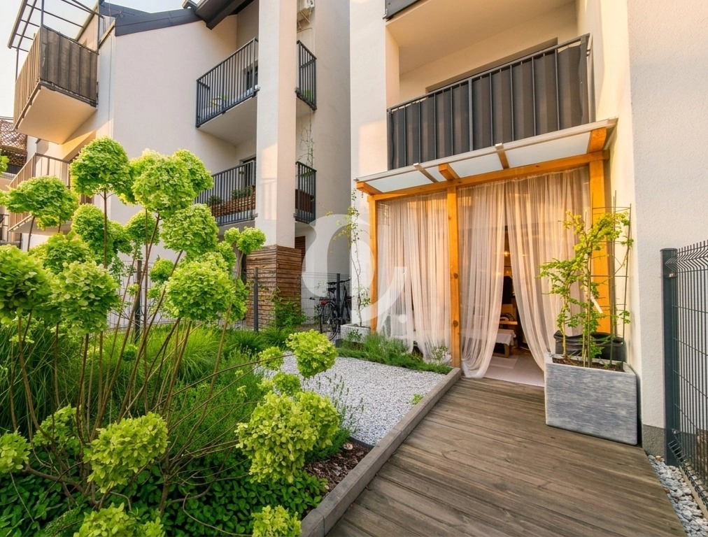 Z salonu wyjście na zadaszony, urządzony taras oraz ogródek o łącznej powierzchni ok. 30 m² – idealne miejsce na poranną kawę, odpoczynek lub spotkania w gronie bliskich.