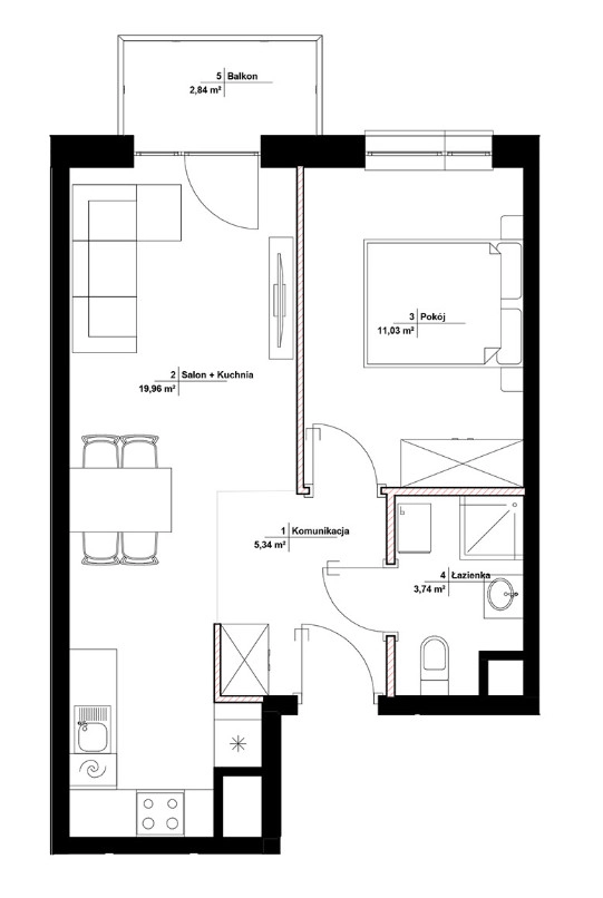 Mieszkanie składa się z – salonu z aneksem kuchennym 19,96m2, sypialni 11,03m2, łazienki 3,74m2, przedpokoju 5,34m2 oraz balkonu 2,84 m2