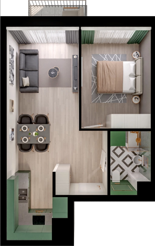 Rzut oraz wizualizacje w ofercie przedstawiają przykładowy sposób aranżacji wnętrza. Powyższa oferta ma charakter informacyjny i nie stanowi oferty handlowej w rozumieniu art. 66 §1 Kodeksu Cywilnego.