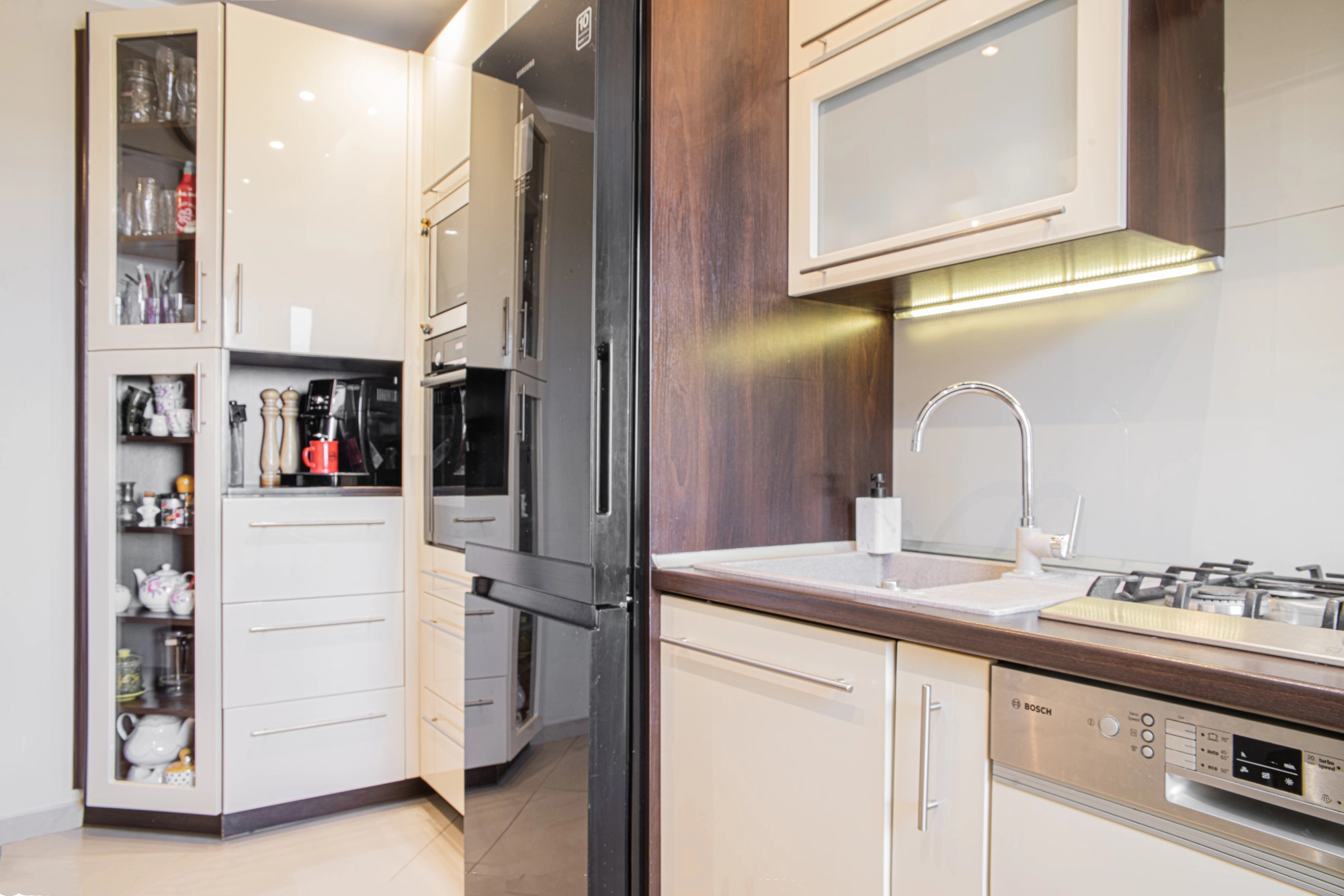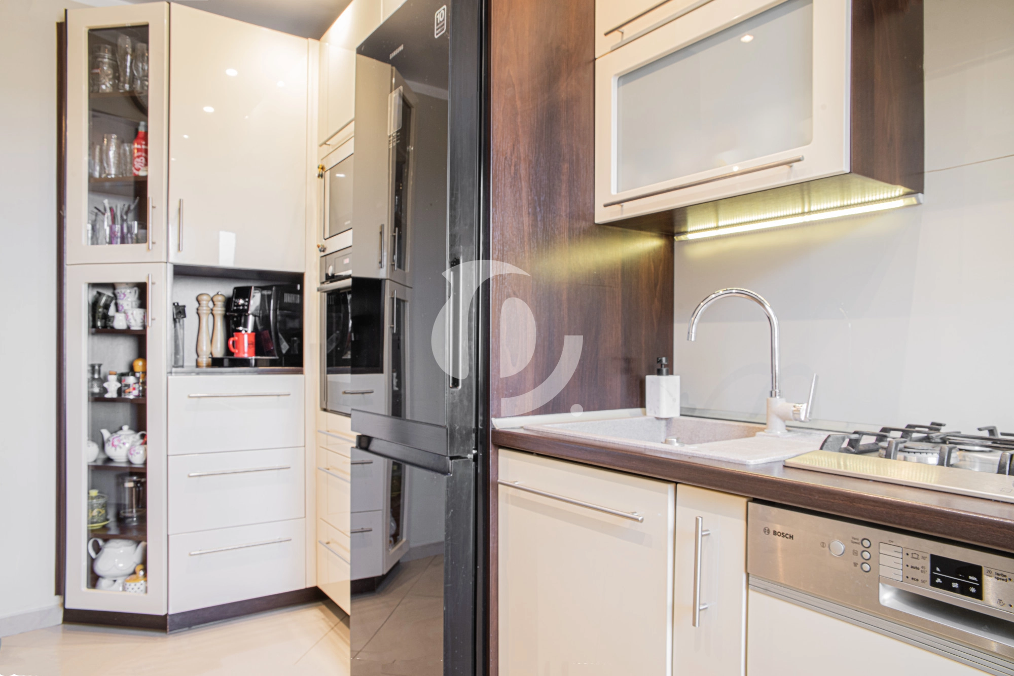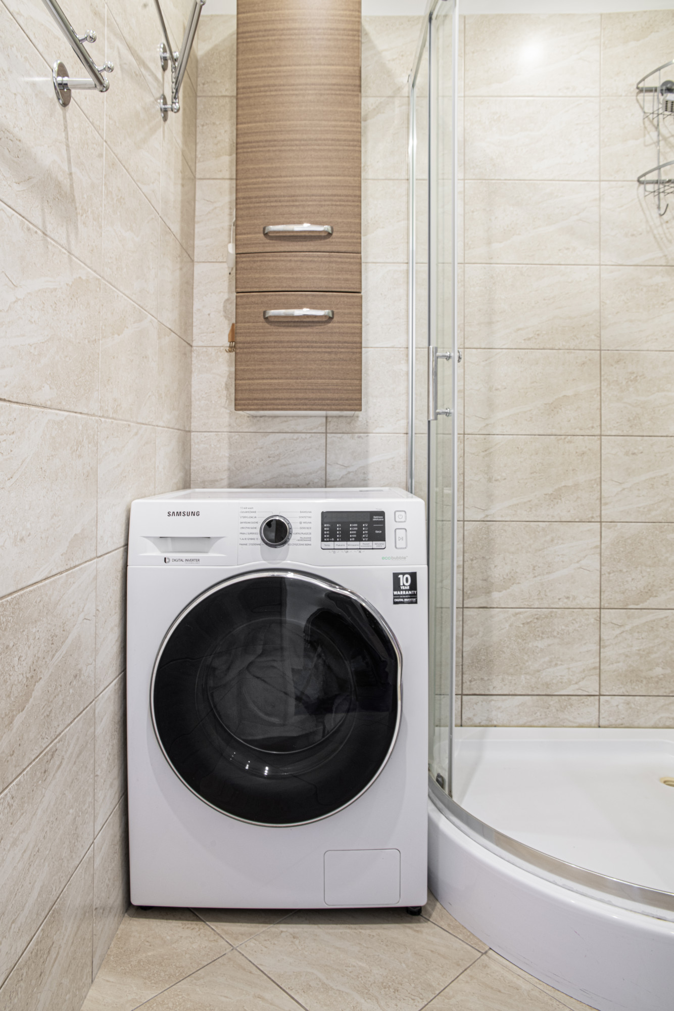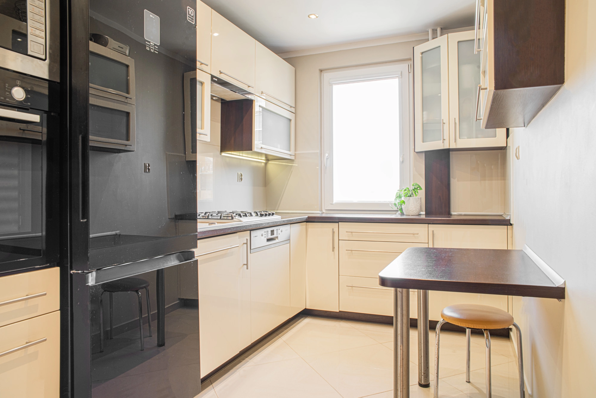 Okna premium PCV – 3-szybowe, w łazience kabina prysznicowa, pralko-suszarka w kuchni – zabudowa na wymiar, sprzęty AGD: lodówka z zamrażarką, zmywarka, piekarnik, okap, płyta gazowa