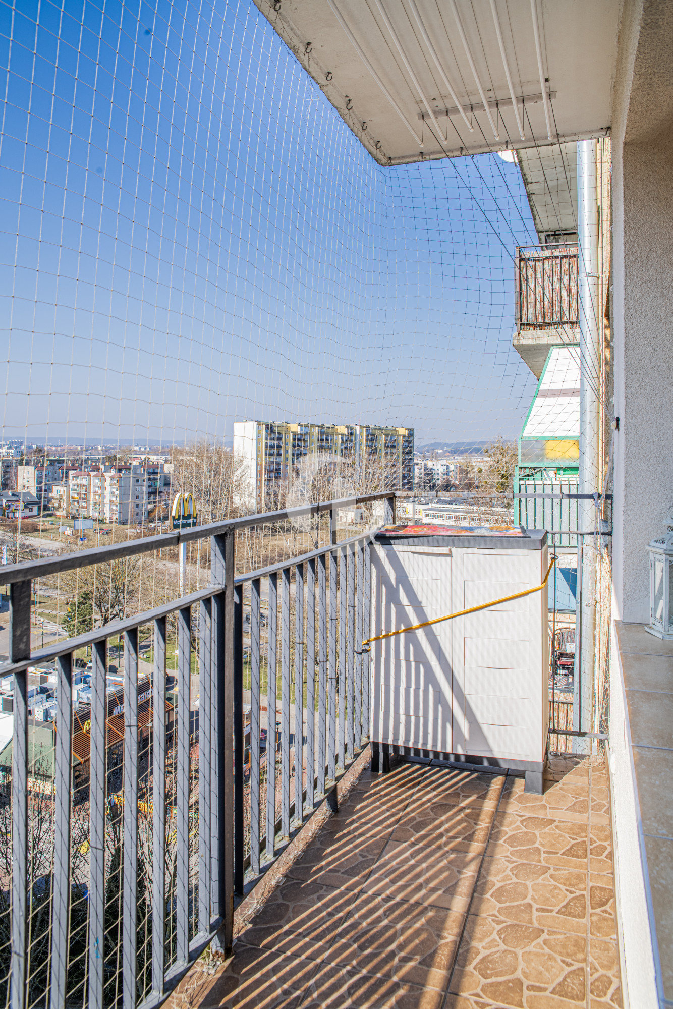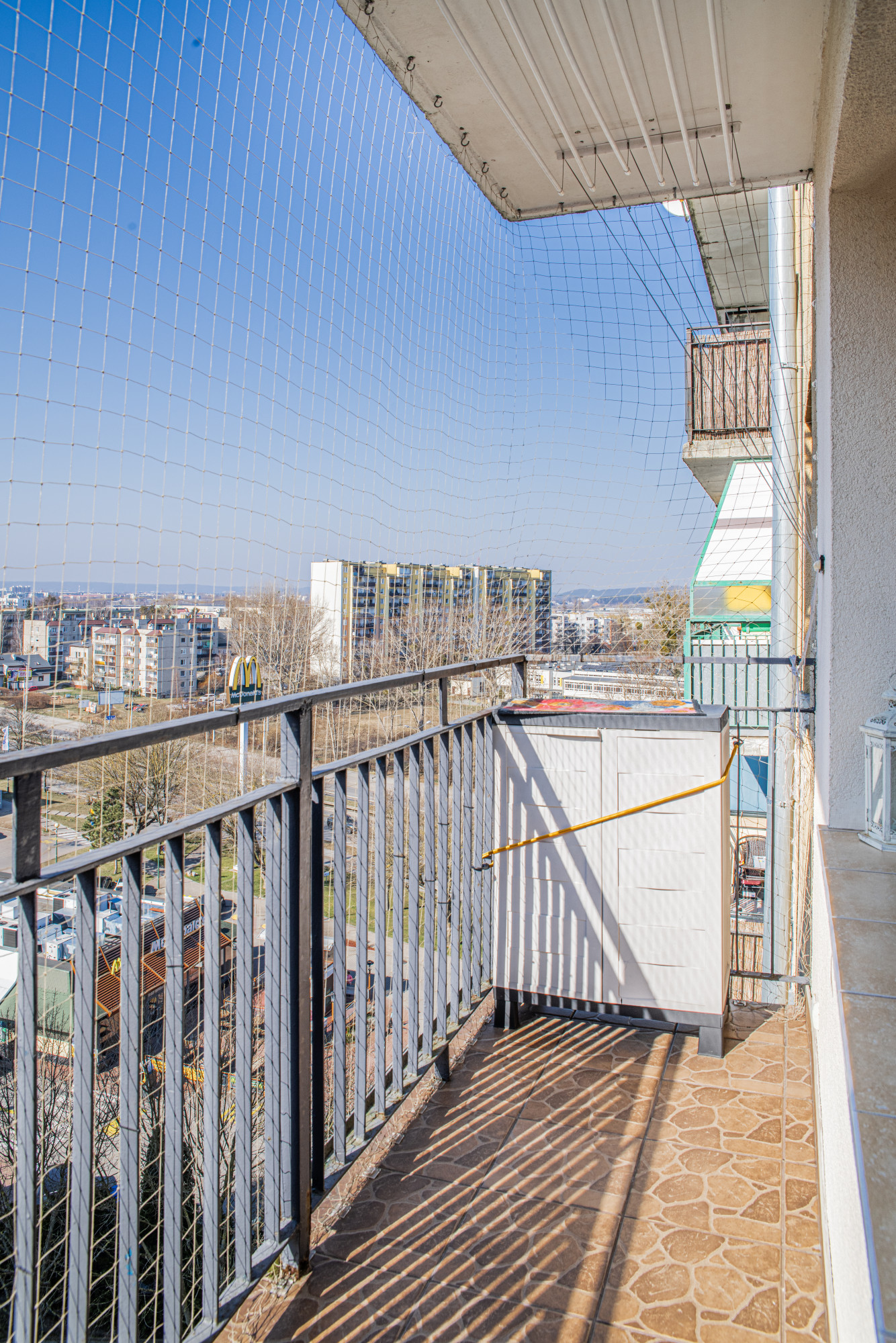 Duży balkon z siatką zabezpieczającą