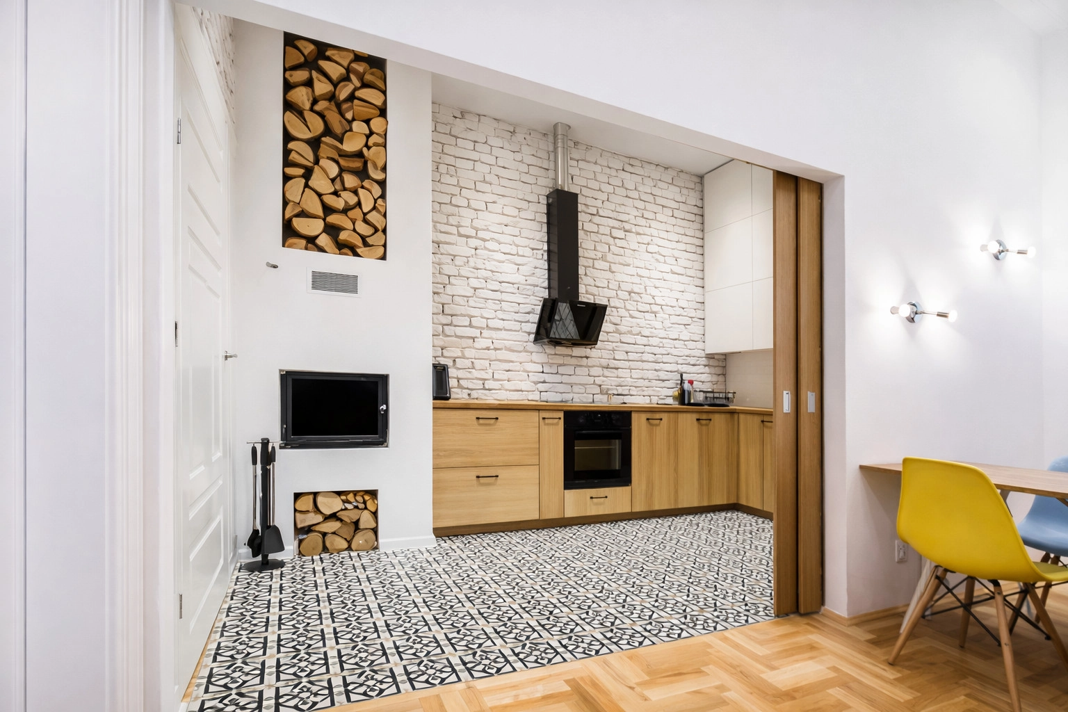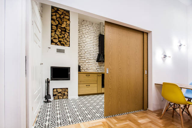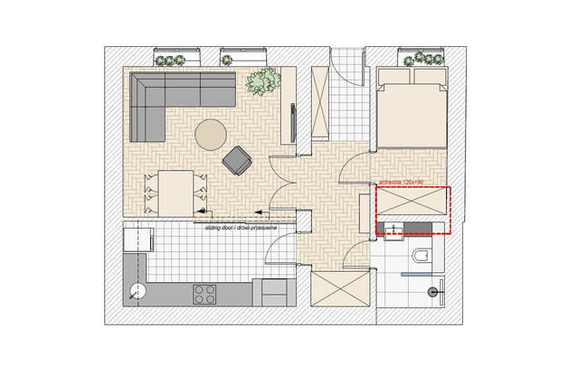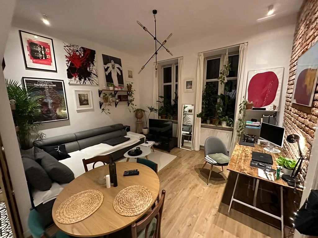 Mieszkanie składa się z przestronnego salonu z aneksem kuchennym, sypialni, łazienki oraz przedpokoju. Sporym atutem jest sposób połączenia salonu z kuchnią – dzięki dużym przesuwnym drzwiom – kuchnia i salon mogą funkcjonować jako niezależne pomieszczenia z osobnymi wejściami. Co jest szczególnie istotne w wariancie najmu oraz najmu krótkoterminowego – mieszkanie posiada duży potencjał pod tego typu wynajem.