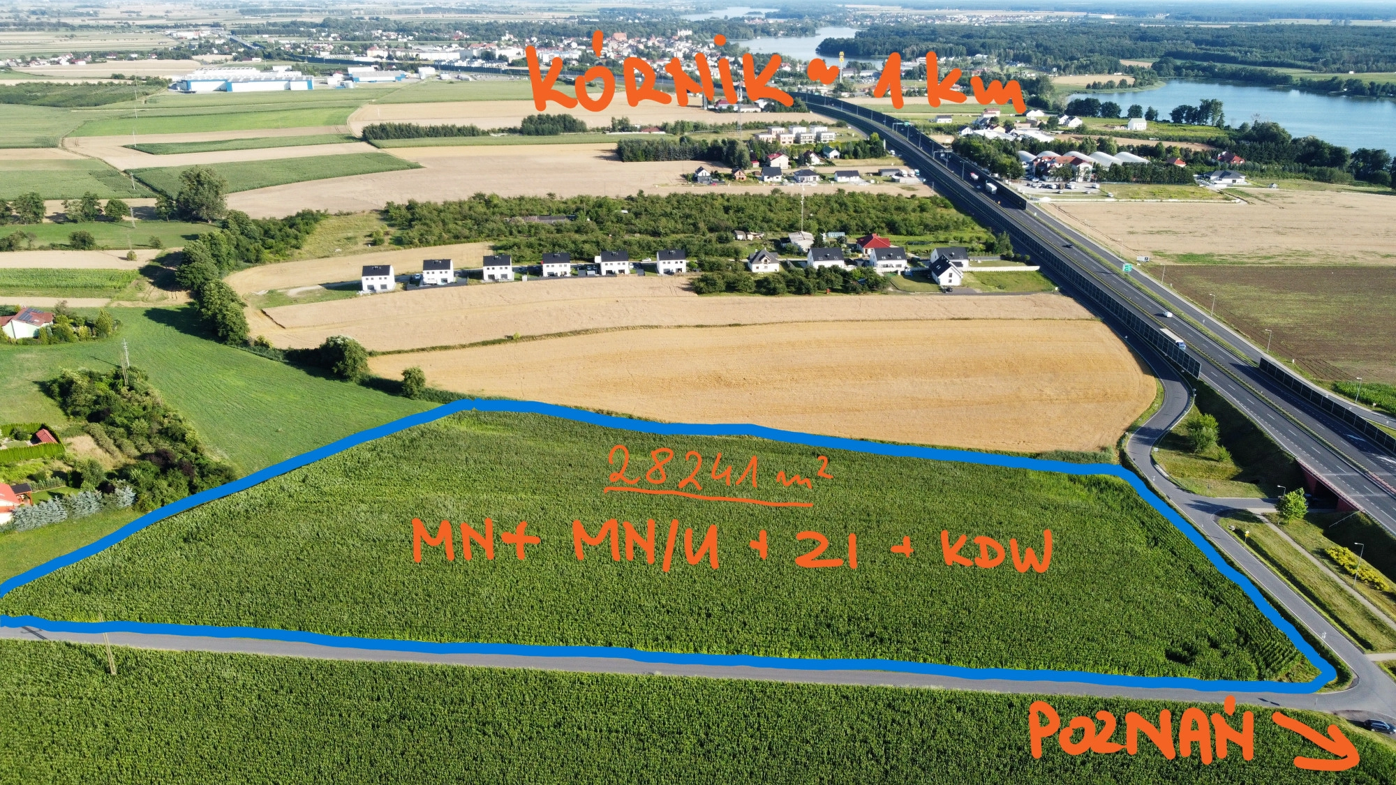 Dojazd drogą asfaltową. Do Kórnika ok 1,5 kilometra, ok 20km do Poznania (Rondo Rataje).W pobliżu znajduje się przystanek komunikacji podmiejskiej (400 metrów). Bezpośrednie sąsiedztwo to tereny rolnicze oraz zabudowa jednorodzinna.