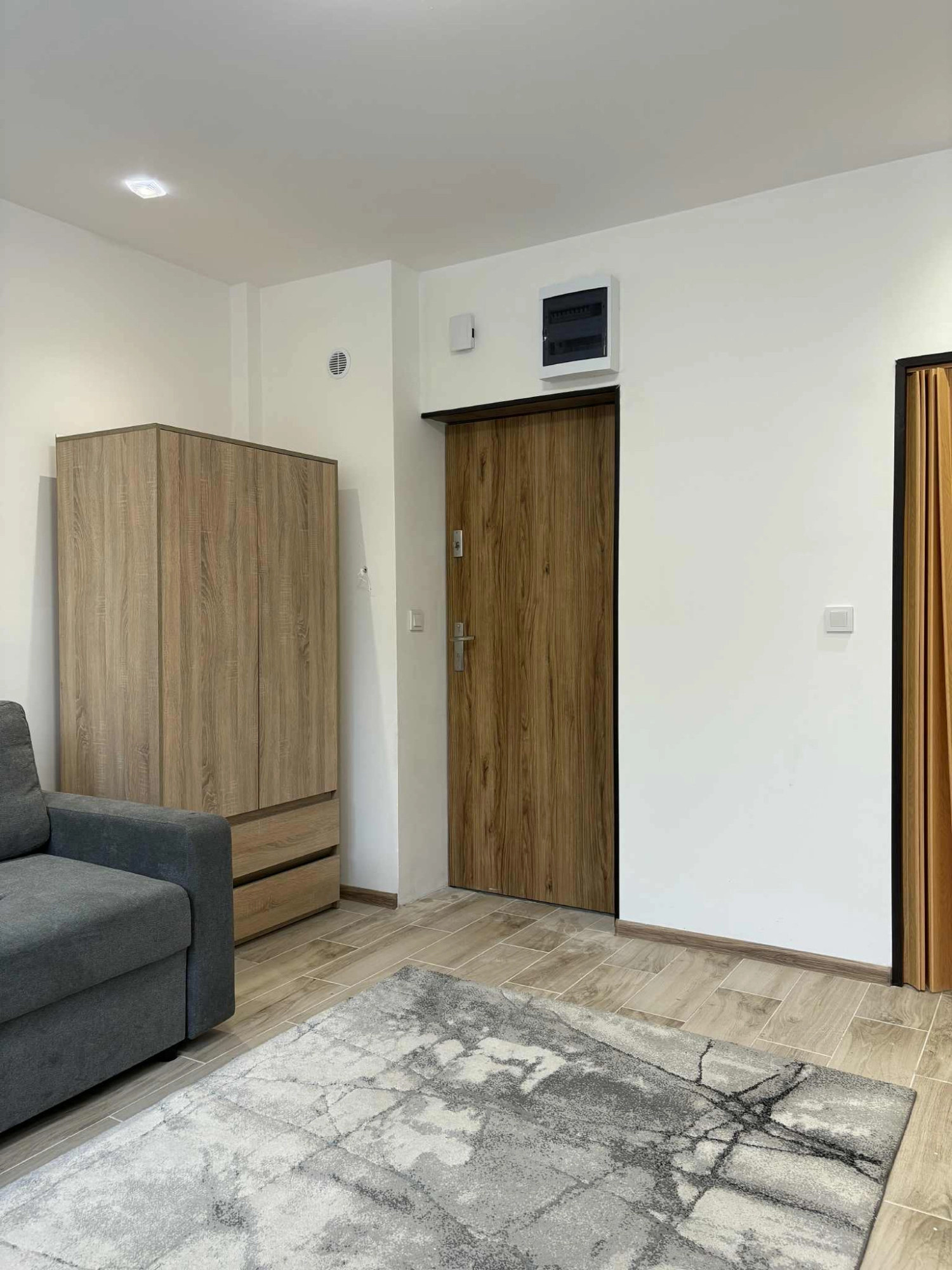 Kawalerka składa się z pokoju dziennego z aneksem kuchennym oraz łazienki. Całe mieszkanie przeszło generalny remont, po którym nie było jeszcze zamieszkane.