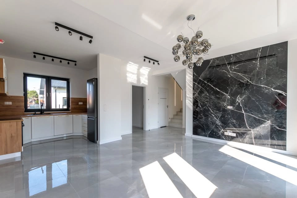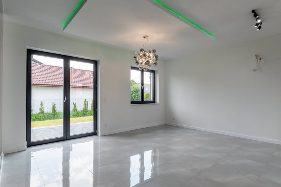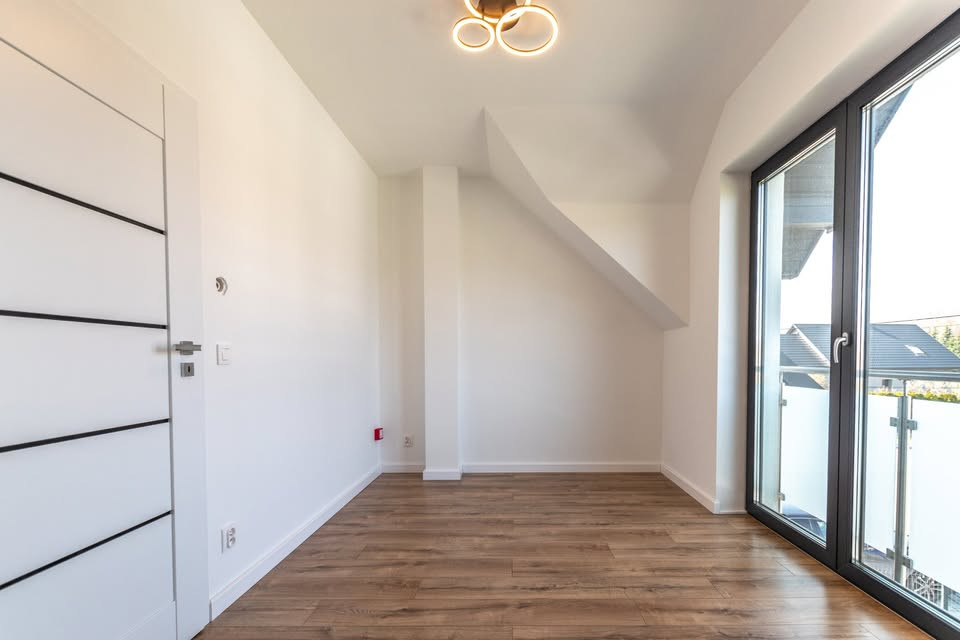 Podłogi wyłożone panelami podłogowymi a w każdym pokoju niezbędna instalacja TV i internetowa. Dom gotowy do zamieszkania.