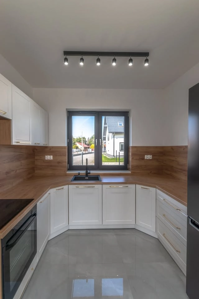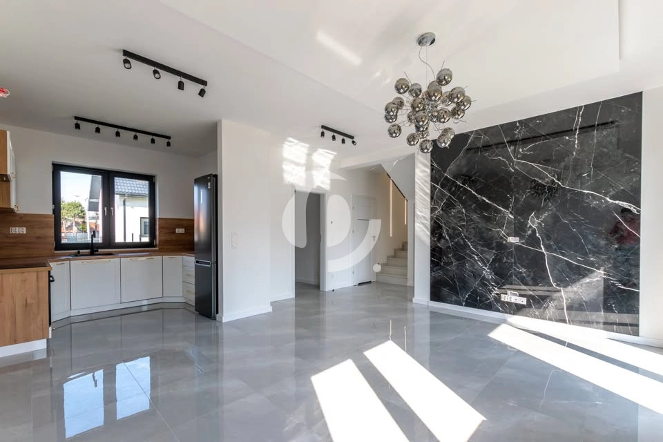 Łączna powierzchnia użytkowa to 105 m2 (całkowita137,82 m2) na którą składa się: kuchnia (wyposażona w zmywarkę firmy Bosch w zabudowie, piekarnik z płytą grzewczą w zabudowie i lodówkę).