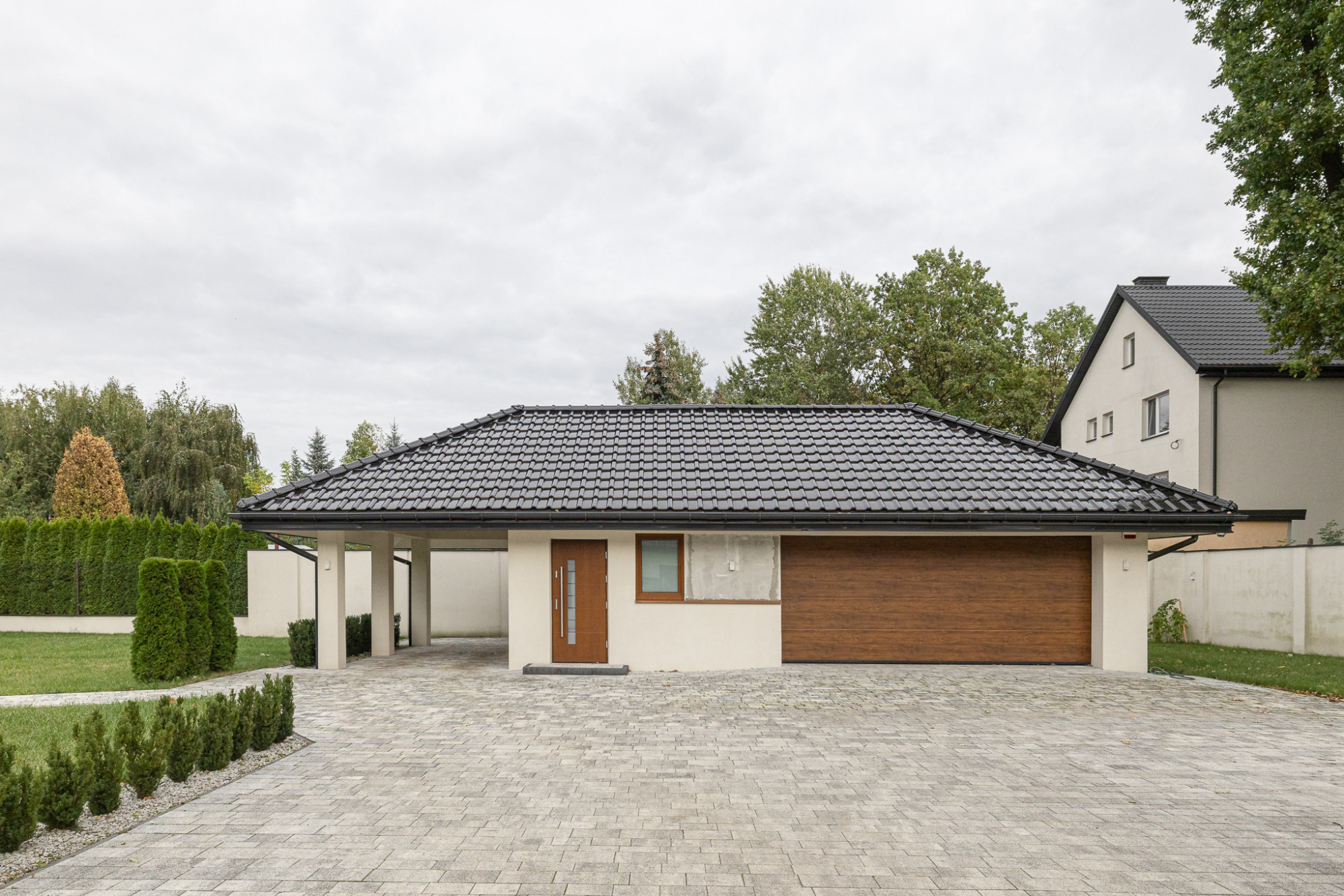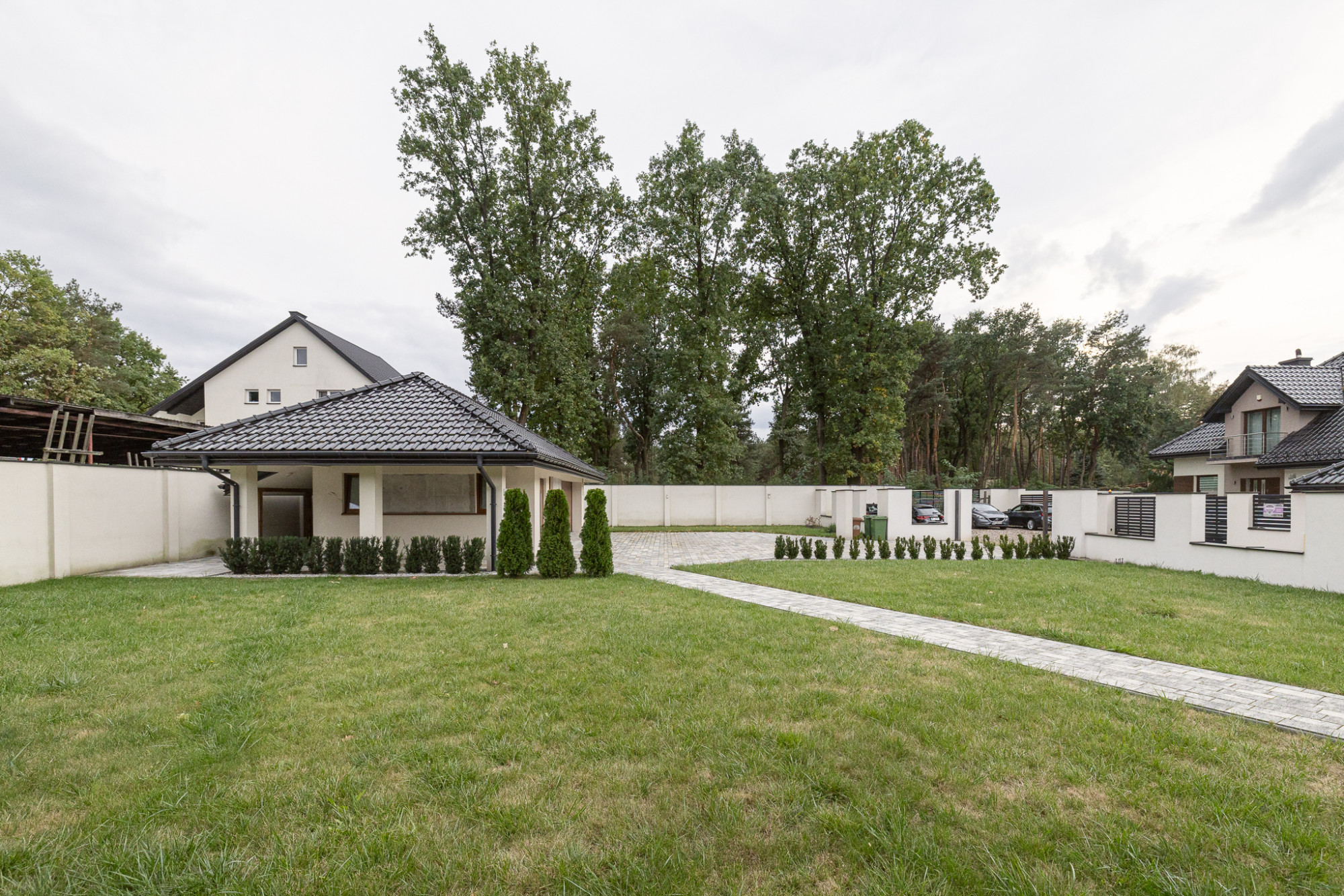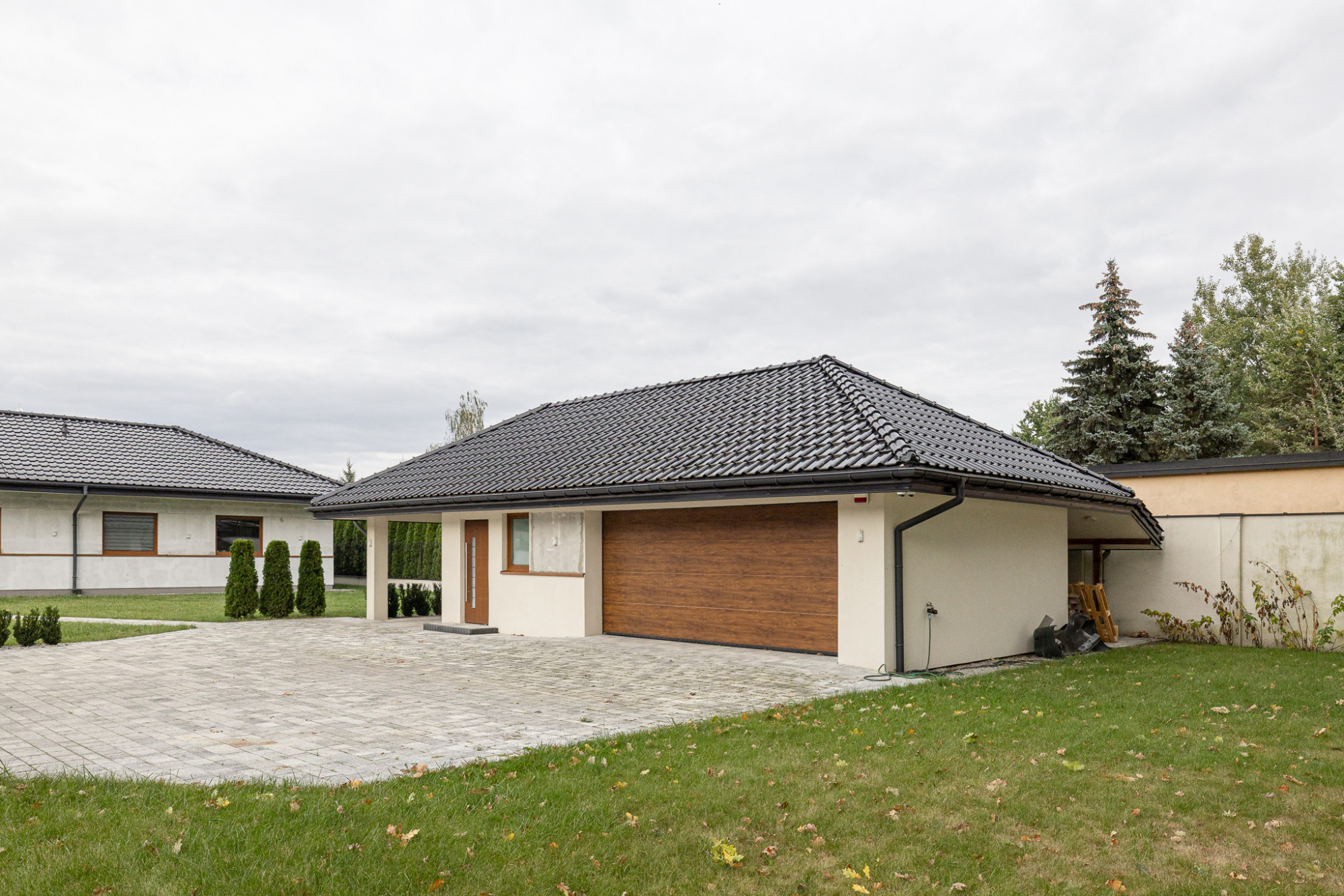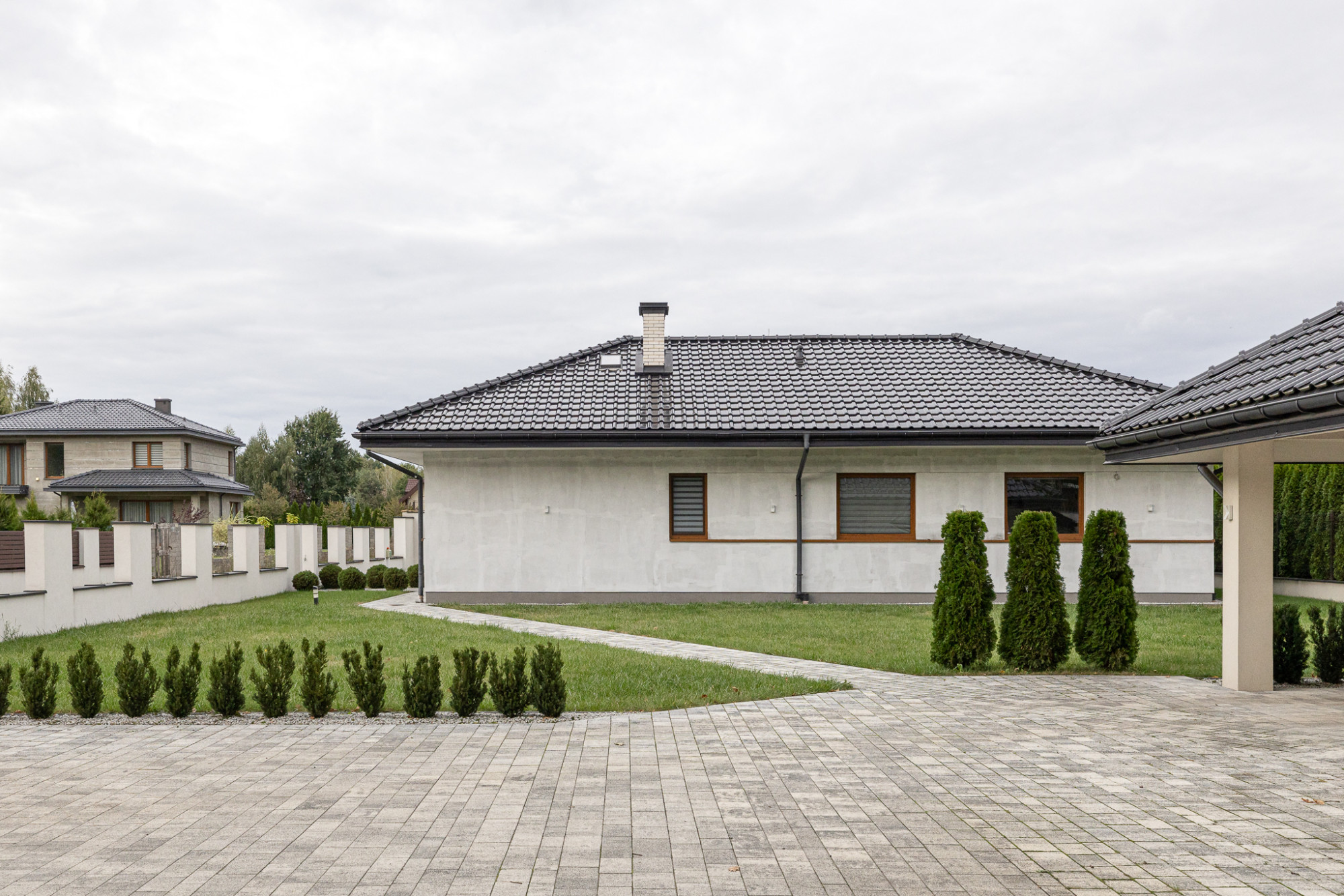 Podjazd, tarasy oraz opaska wokół budynków wyłożone płytkami brukowymi.
