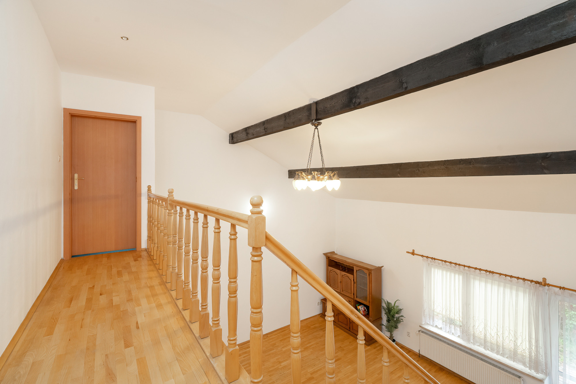 Piętro to strefa prywatna mieszkańców. Trzy sypialnie – w tym jedna z przestronną garderobą, zapewniają komfortowe miejsce do wypoczynku. Duża łazienka oferuje wygodę i przestrzeń, gdzie można stworzyć prawdziwe domowe spa. Korytarz jest otwarty na salon, dzięki czemu uzyskano świetny efekt przestrzenności tego domu.