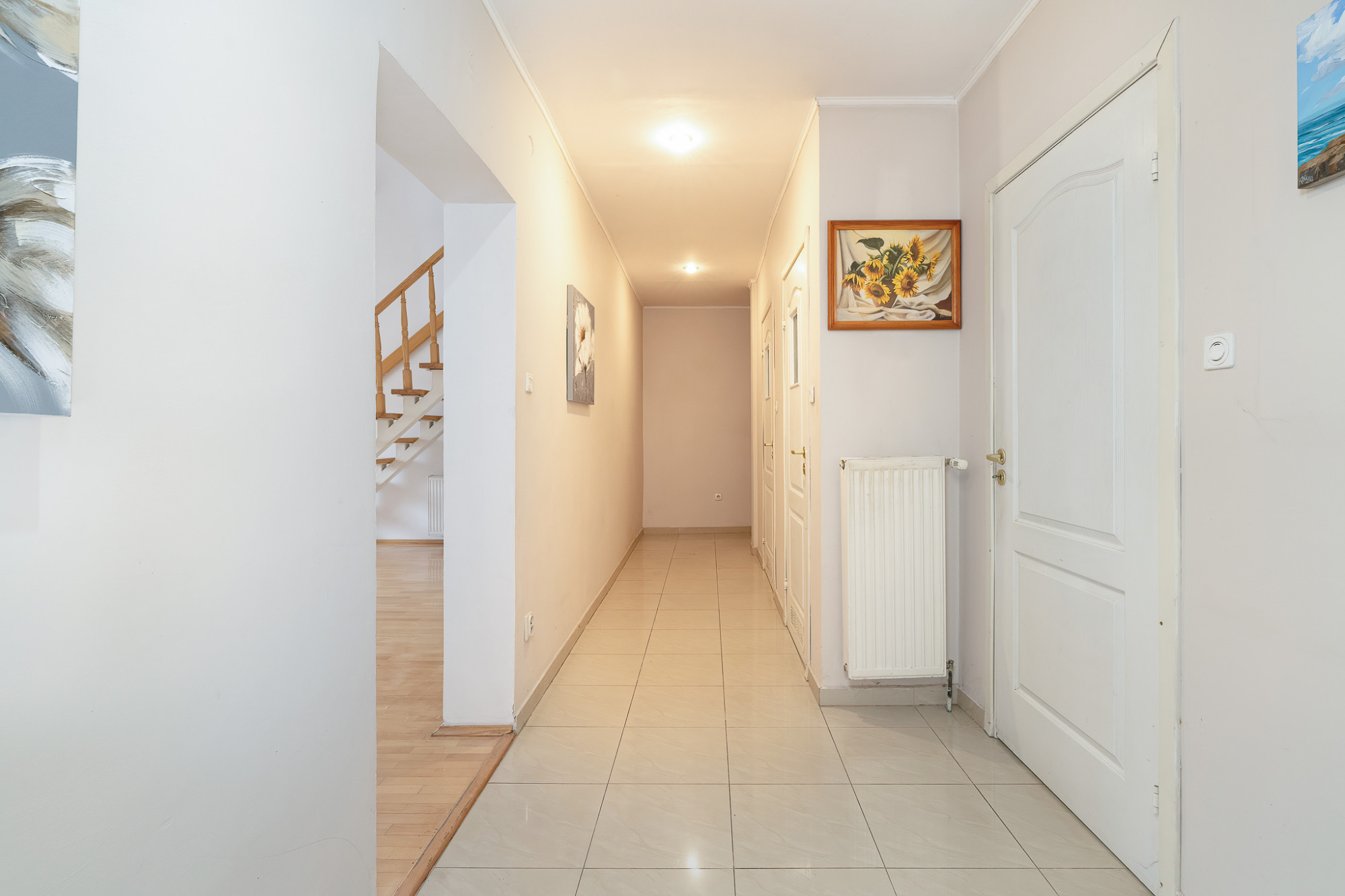 **Na parterze** znajduje się serce domu – imponujący salon o wysokości aż 5,6 metra, który dzięki dużym przeszkleniom wpuszcza do wnętrza mnóstwo naturalnego światła. Bezpośrednie wyjście na taras sprawia, że ogród staje się przedłużeniem strefy wypoczynkowej, idealnej do relaksu, rodzinnych spotkań i cieszenia się zielenią. Przestronna kuchnia z miejscem na dużą jadalnię zaprasza do kulinarnych eksperymentów, a osobne pomieszczenia, takie jak pralnia, kotłownia, czy dodatkowa łazienka i WC, zwiększają komfort codziennego funkcjonowania.