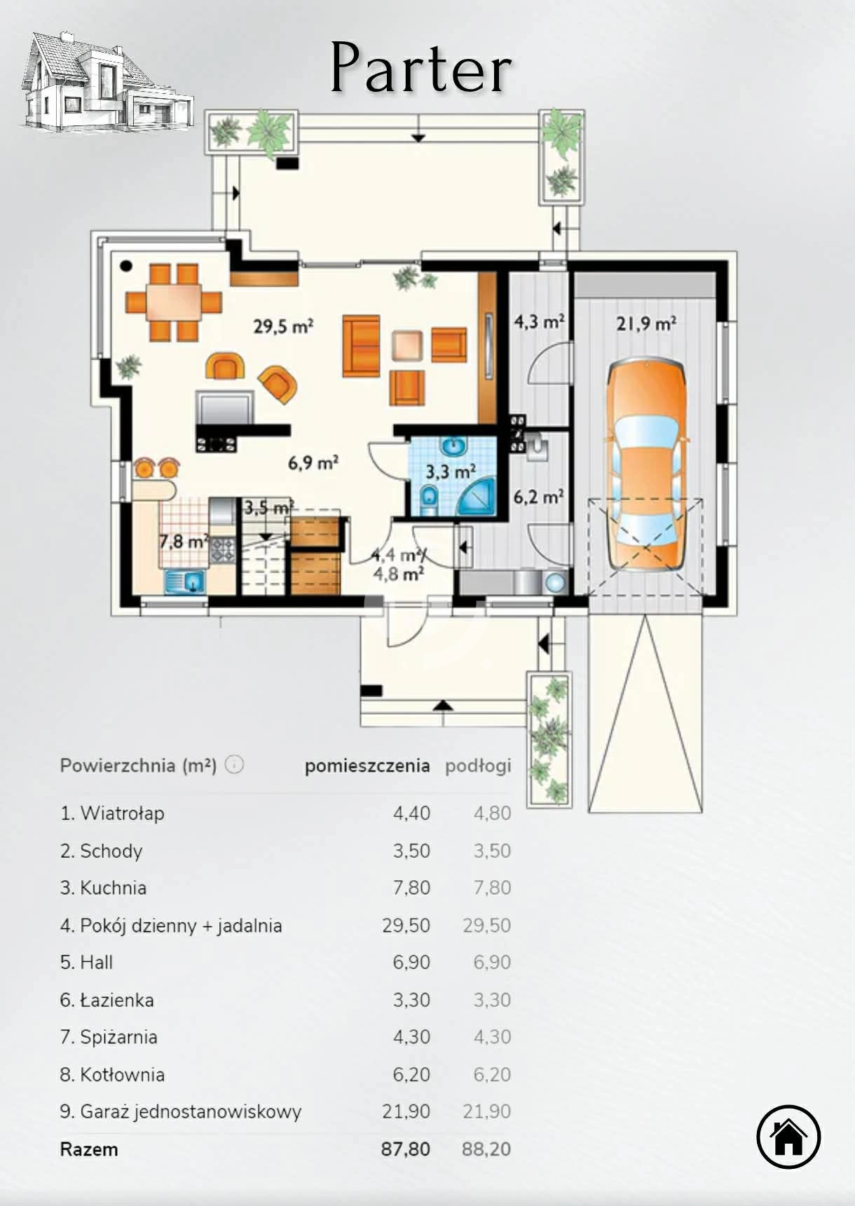 Stolarka: okna Aluplast (7-komorowe, 3-szybowe), nowoczesne okno przesuwne HS, brama garażowa oraz drzwi wejściowe (kolor antracyt).