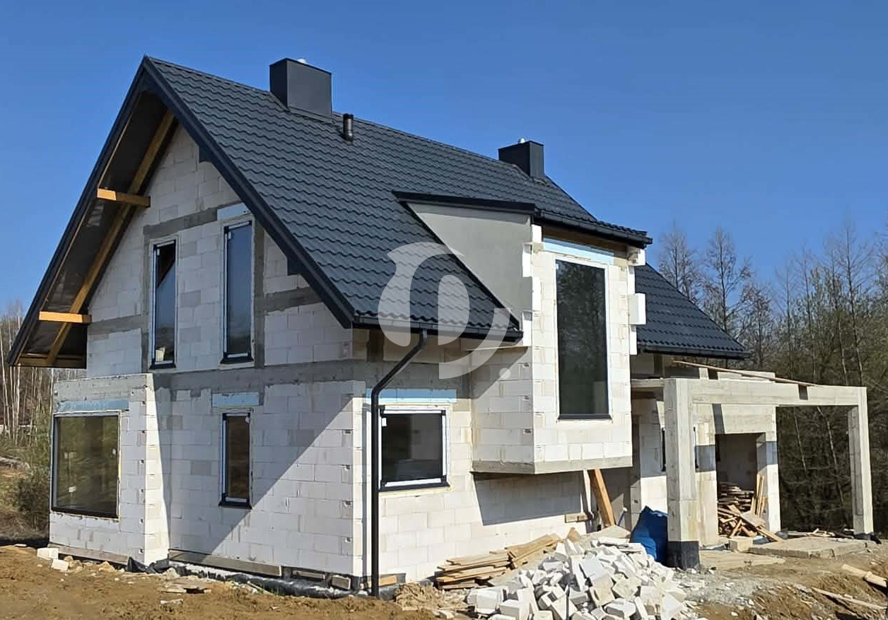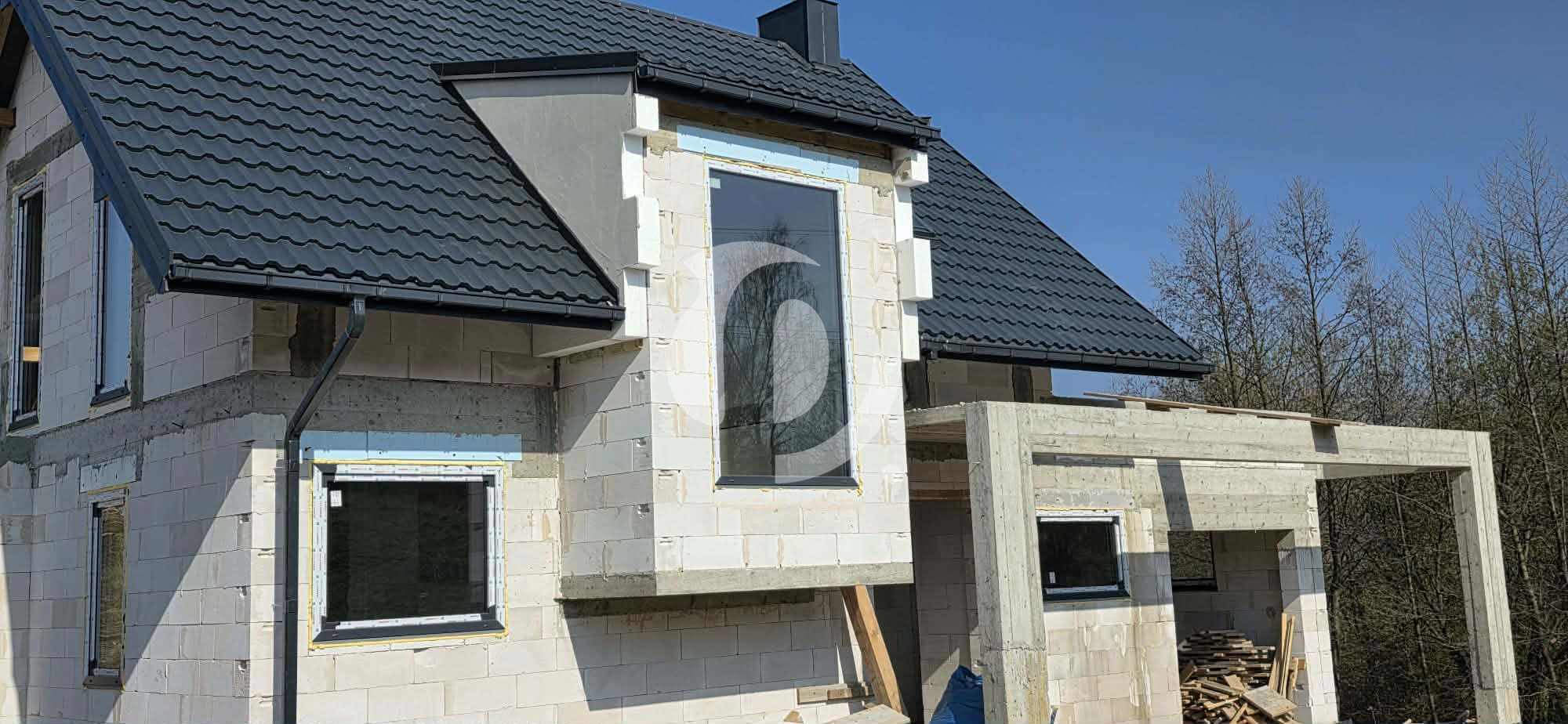 Mury: pustak Styrobud (24 cm), strop żelbetowy, więźba tradycyjna impregnowana.
