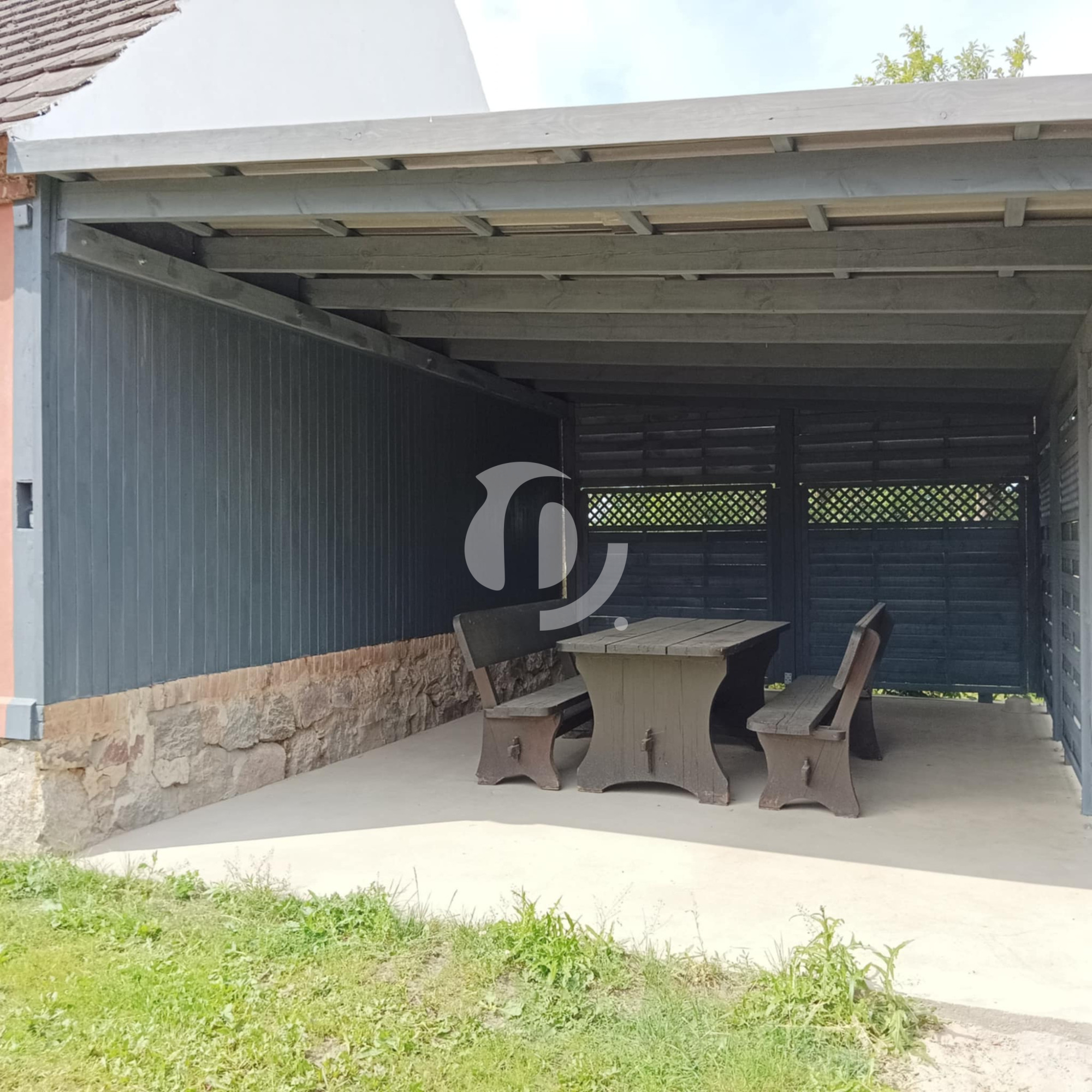 Dom współtworzą dwa tarasy z kojącym widokiem na zieleń, a całość uzupełnia garaż oraz murowana stodoła z miejscem dla konia, kur, kóz wraz z spacerniakiem dla zwierząt, studnia.