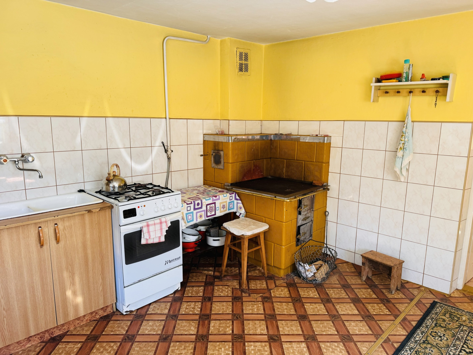 Parter: kuchnia z piecem kaflowym, jednostanowiskowy garaż, kotłownia, pomieszczenie gospodarcze, korytarz