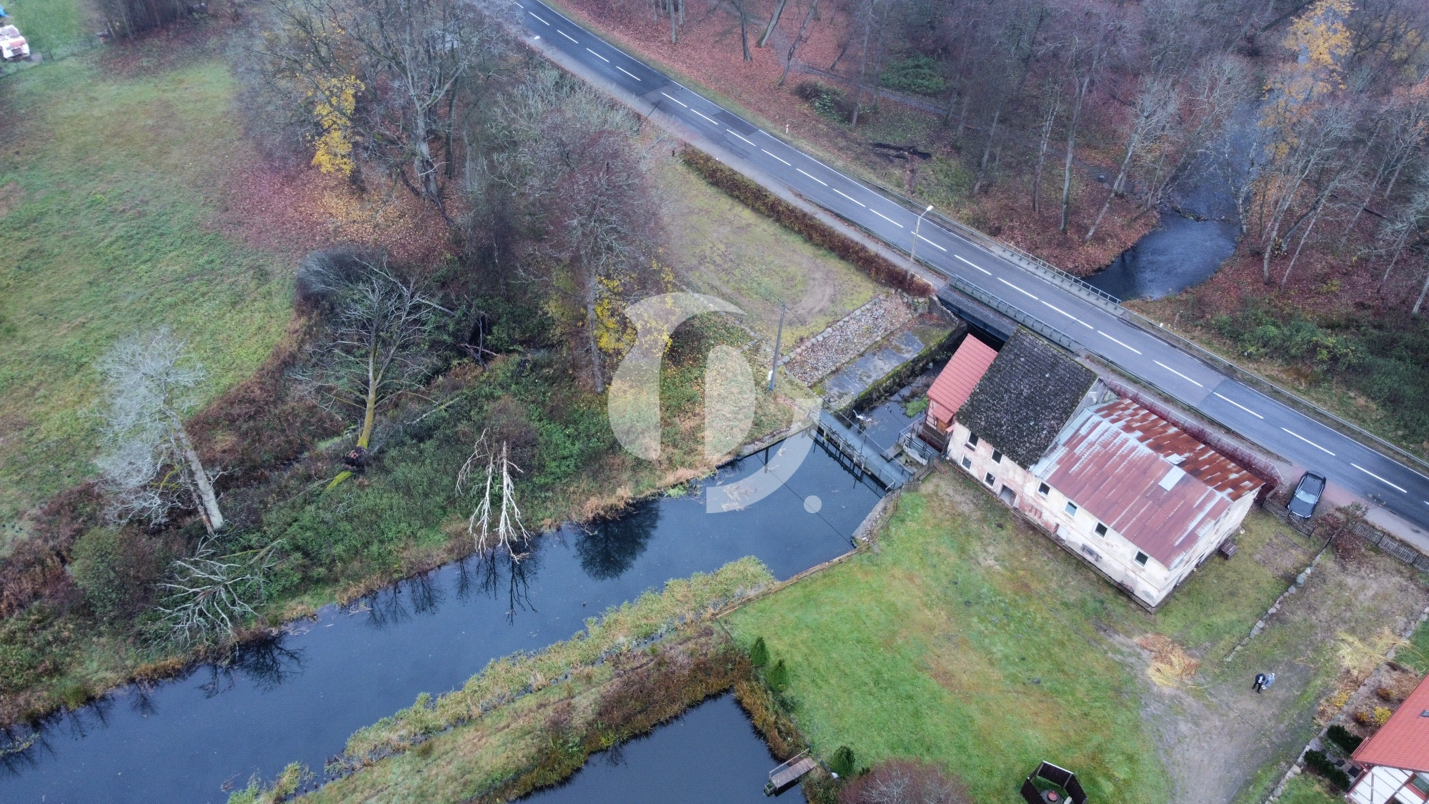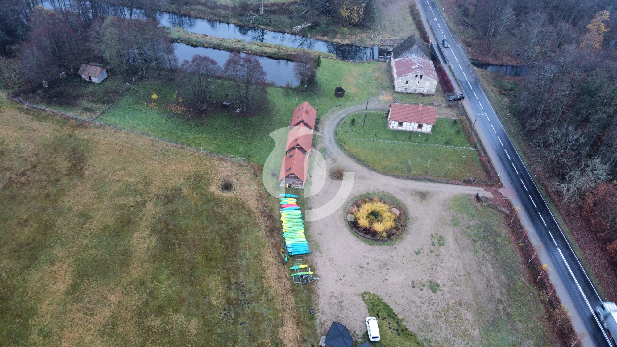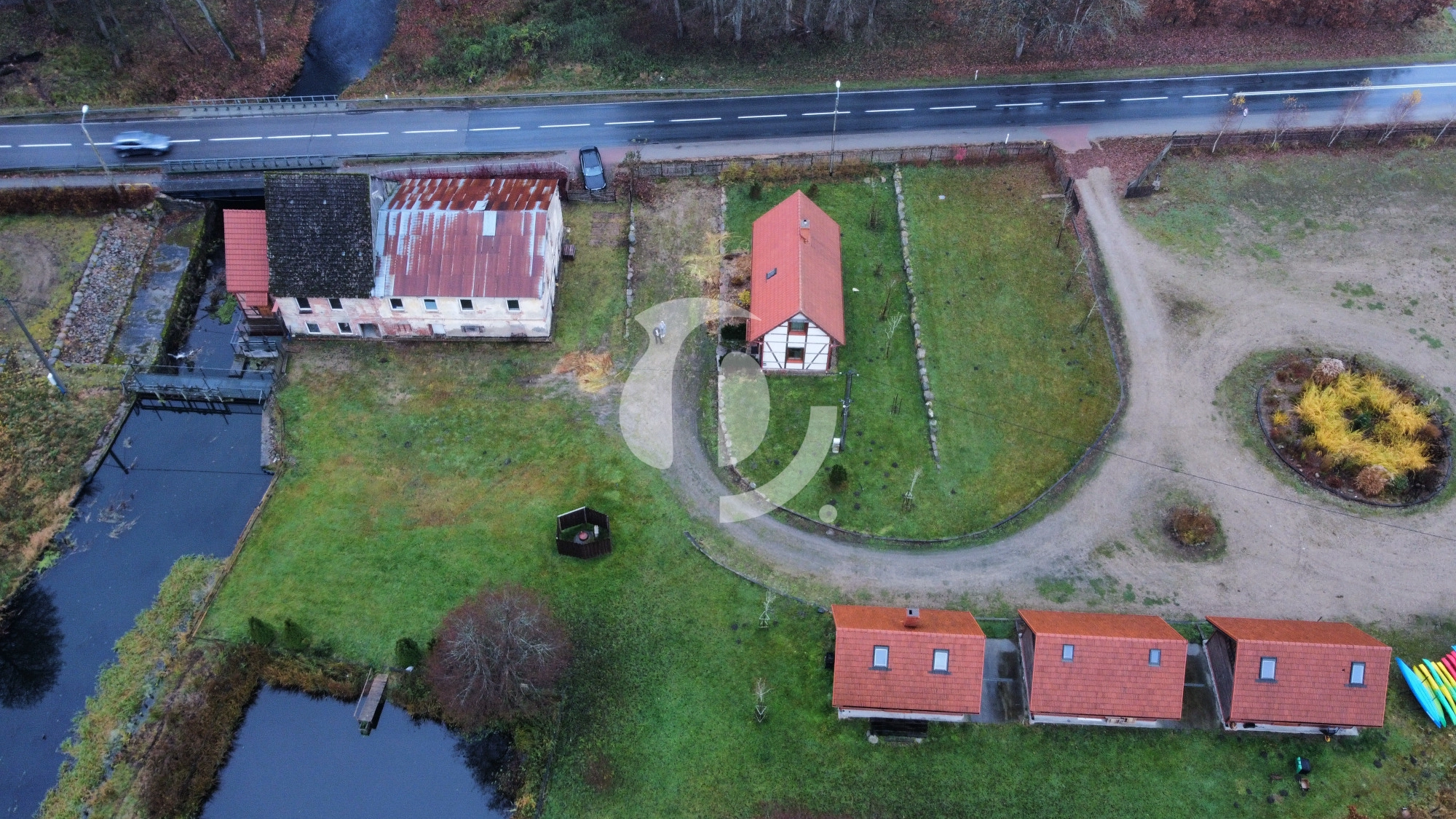 - Młyn wodny o pow. ok. 400m2 ze zmodernizowaną elektrownią wodną o mocy 30kW. Wytworzona energia zasila cały kompleks. Obiekt posiada aktualne pozwolenie na budowę, zakłada przeznaczenie mieszkalne z pokojami do wynajęcia (10 pokoi z łazienkami) i restauracją. Młyn jest zabytkowy i został praktycznie cały odbudowany – rok budowy datowany na XVIII wiek.
