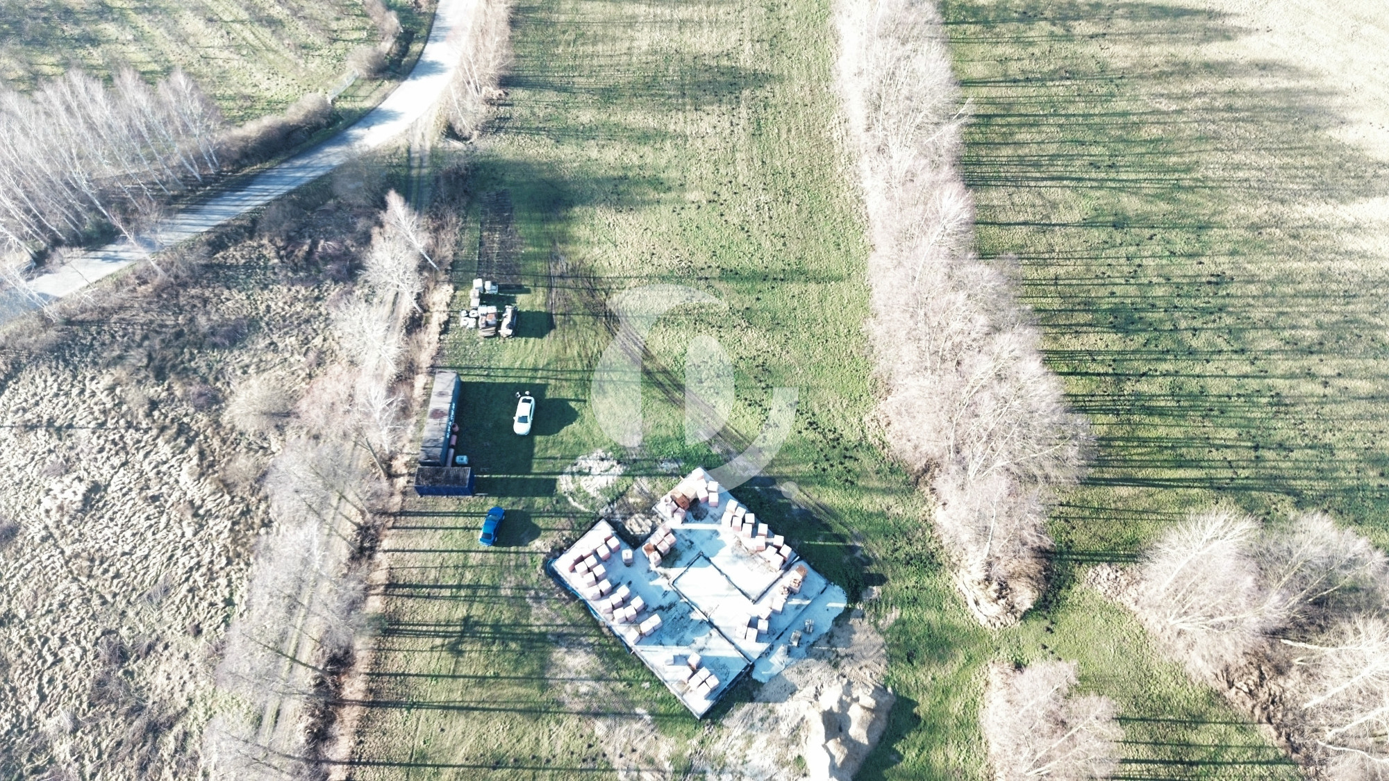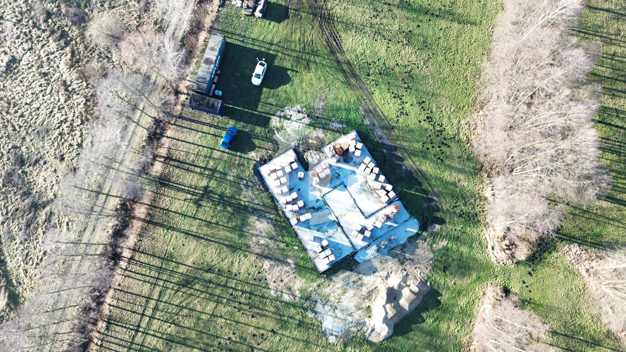 Na działce znajduje się również materiał budowlany widoczny na zdjęciach, który może być wykorzystany do kontynuacji budowy.