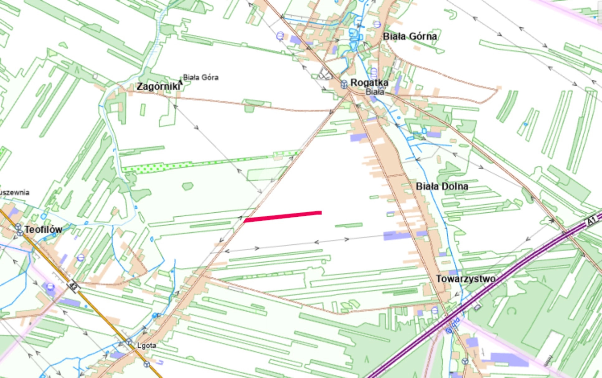 • Odległości: ok. 250 m od najbliższego zabudowania; ok. 1300 m od m. Biała; ok. 1500 m od zjazdu z drogi krajowej nr 43 w m. Lgota