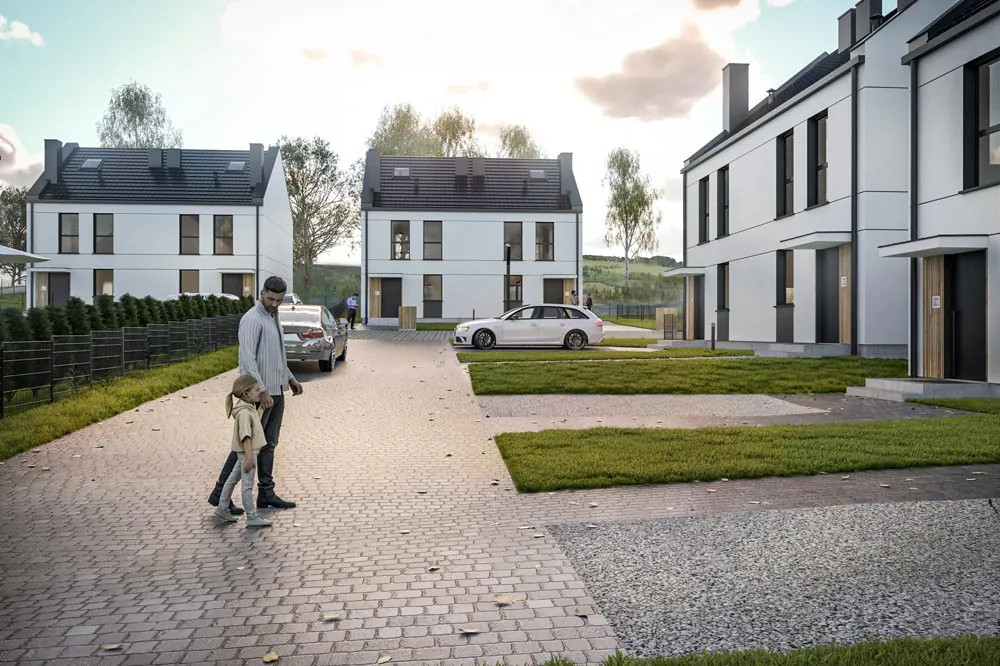 • Dwa miejsca parkingowe na wyłączność przed każdym domem – koniec z poszukiwaniem parkingu!