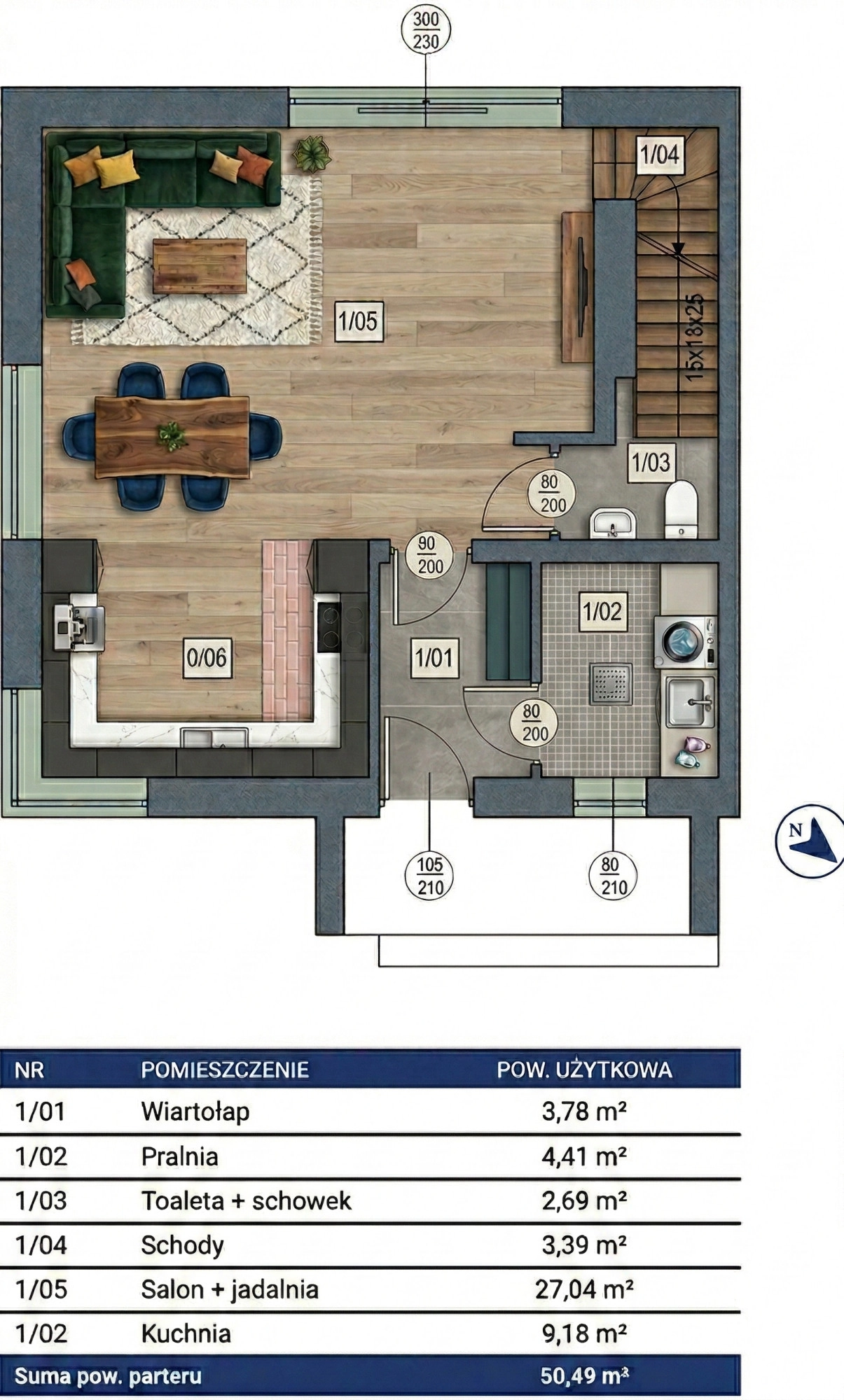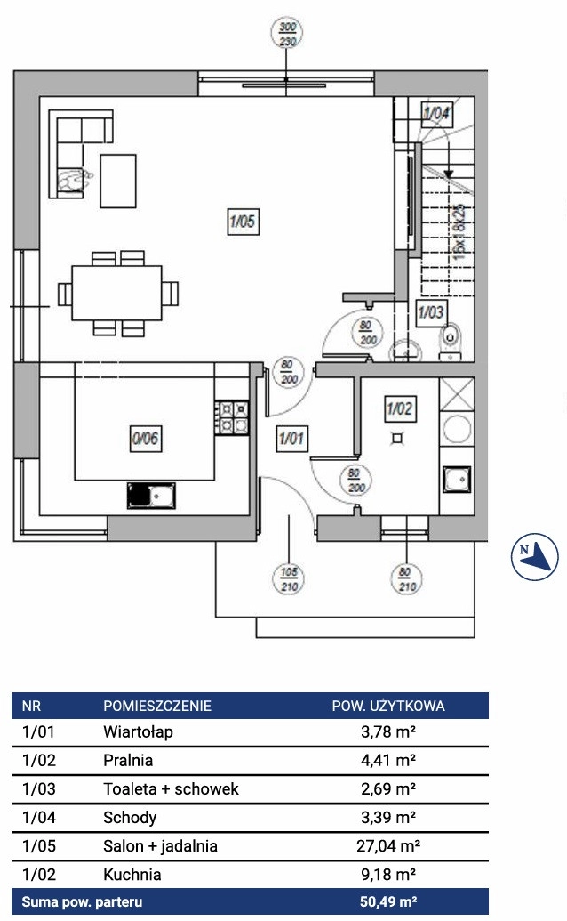 Parter: salon z jadalnią, kuchnia, pralnia, toaleta, wiatrołap — łączna powierzchnia parteru 50,49 m².