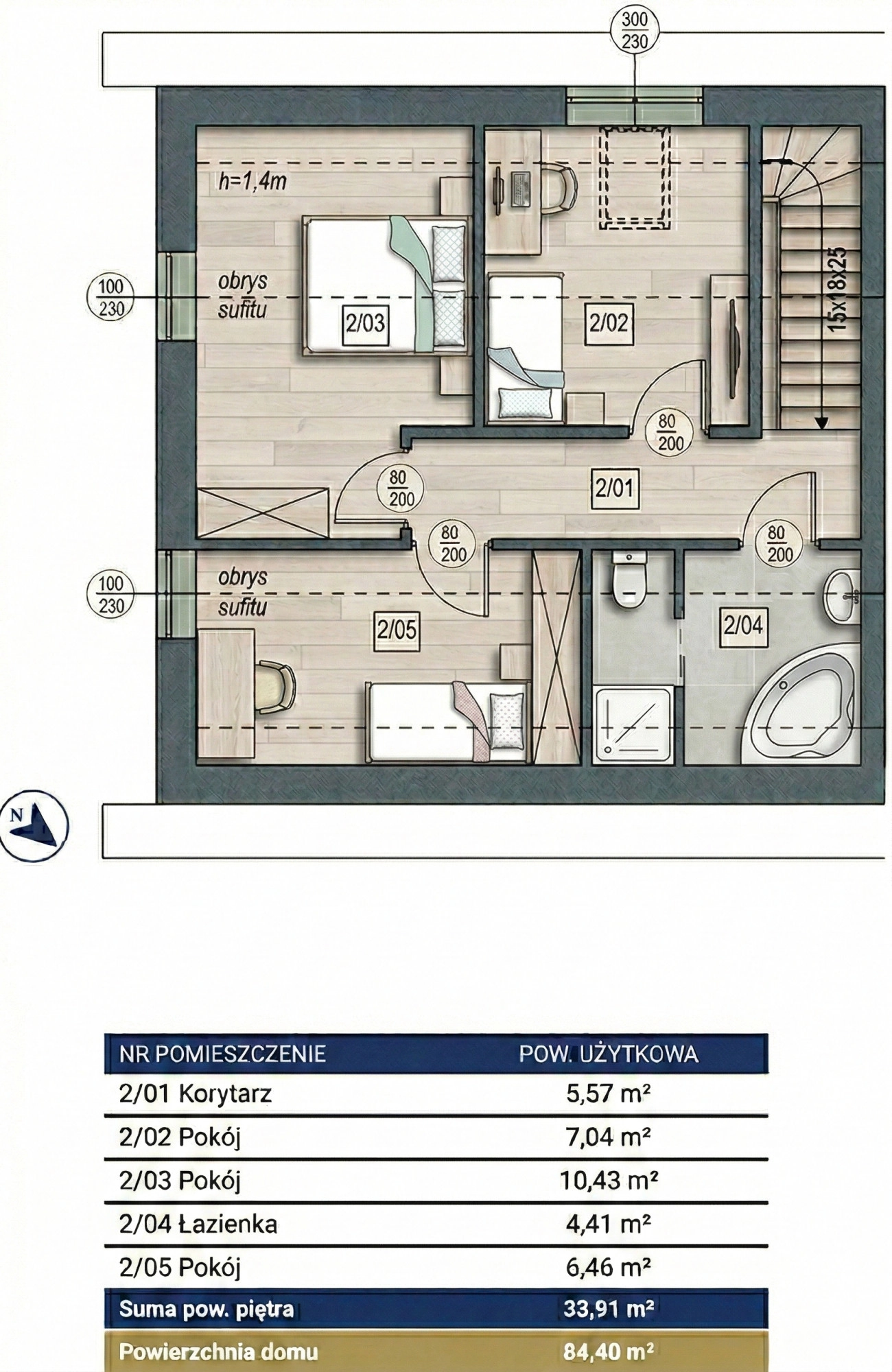 Piętro: sypialnie, łazienka, korytarz — łączna powierzchnia piętra 33,91 m².