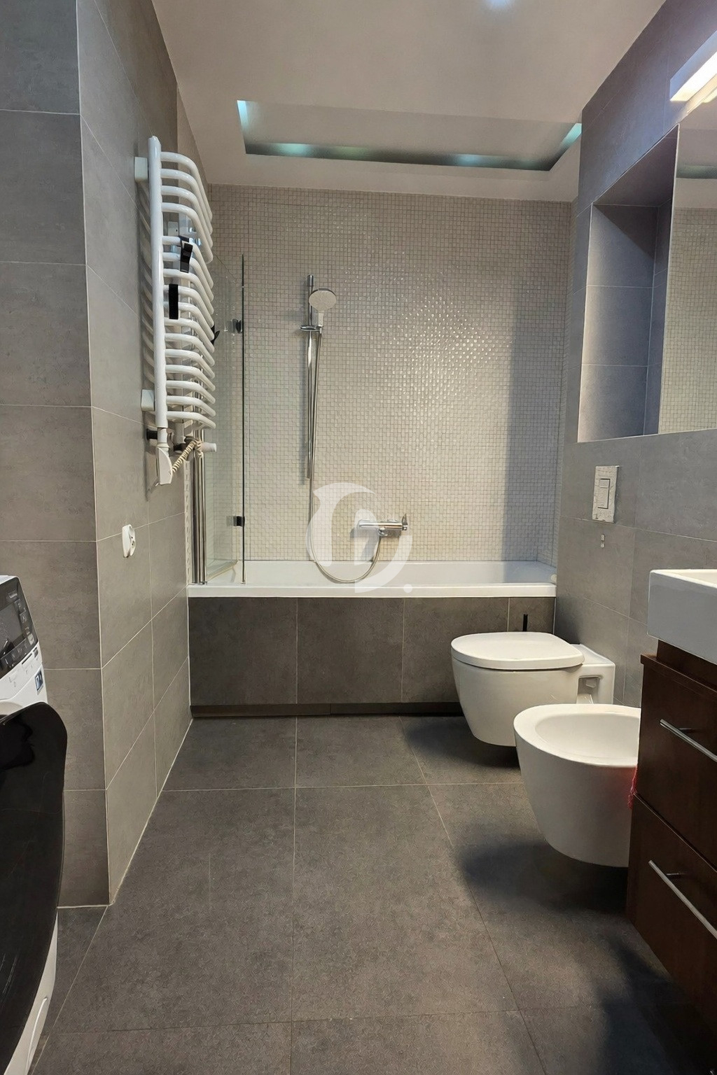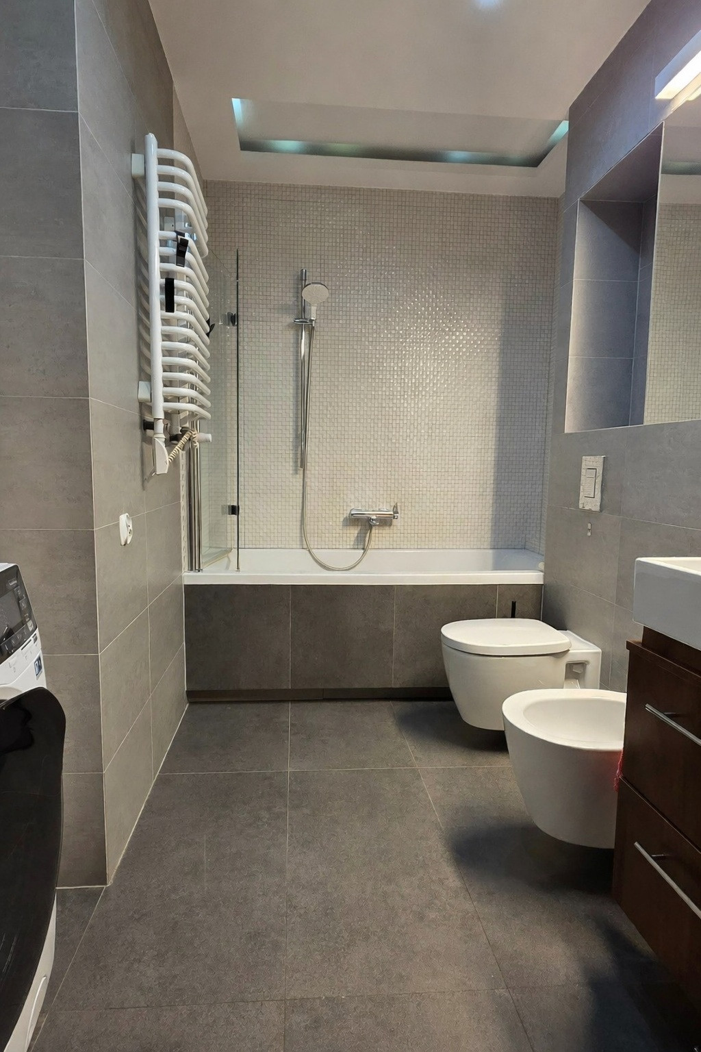 – łazienka z wanną i wnęką na zabudowę pralki