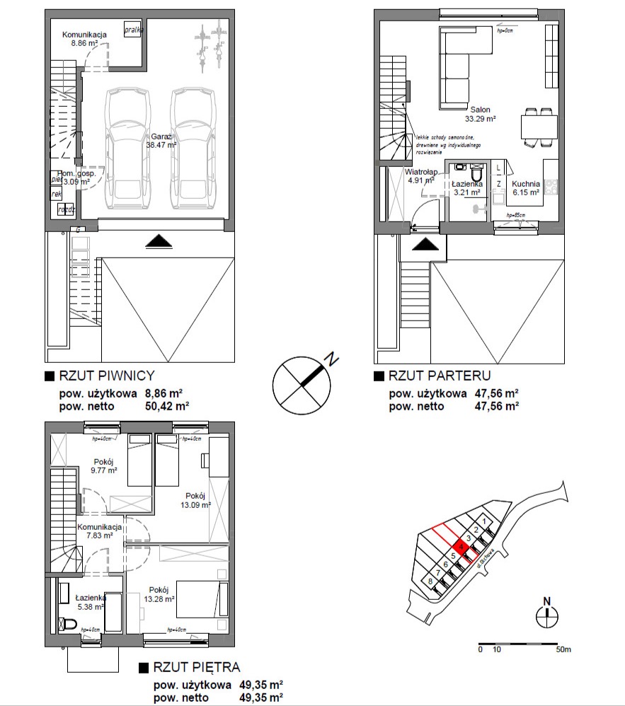 • Pierwsze Piętro (49,35 m²): ta kondygnacja jest strefą prywatną. Składa się z trzech komfortowych sypialni (o pow. 13,28 m², 13,09 m² i 9,77 m²) oraz przestronnej łazienki (5,38 m²), zapewniającej intymność i wypoczynek wszystkim domownikom.