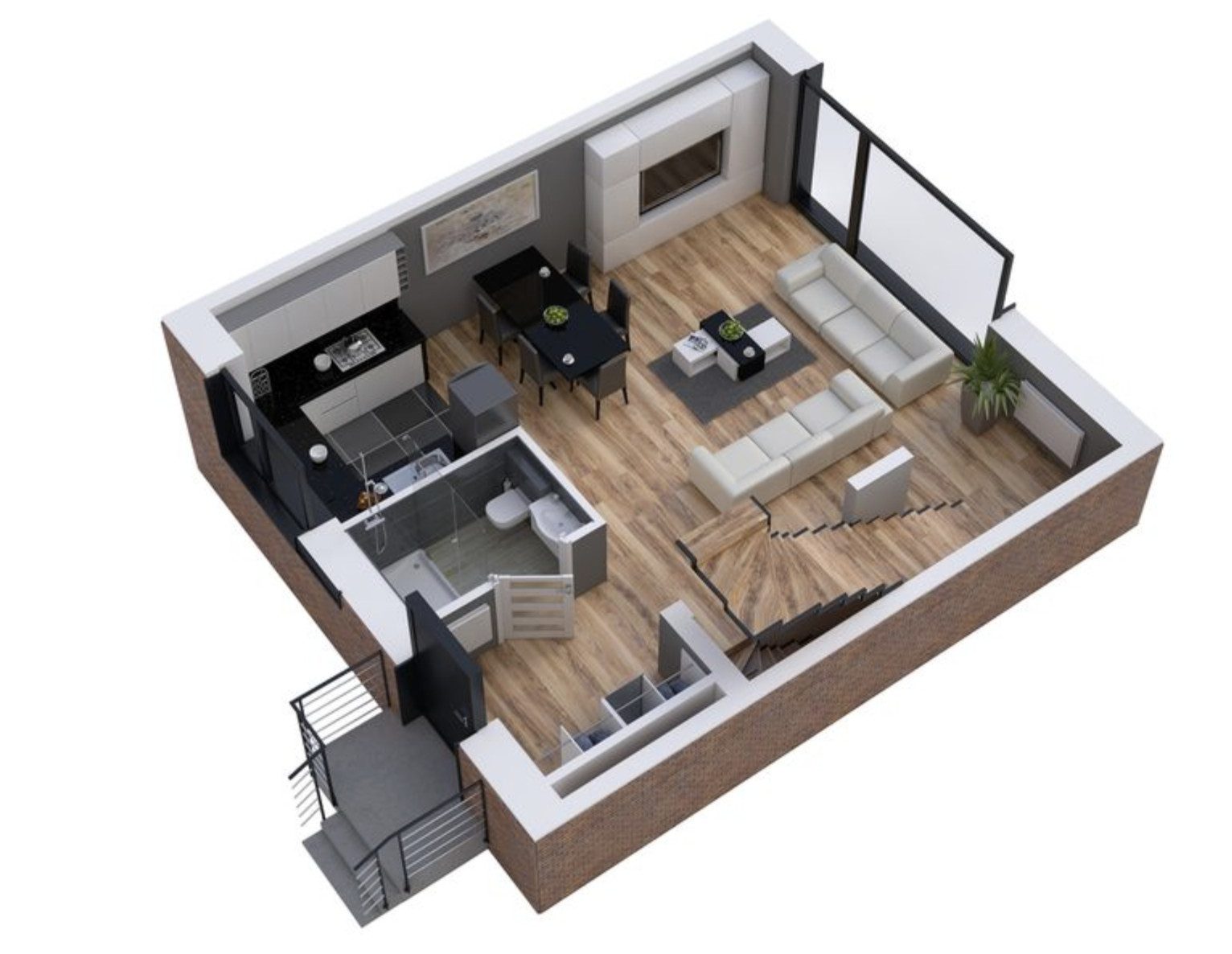 • Parter (47,56 m²): wejście przez przestronny wiatrołap prowadzi do olśniewającej, otwartej przestrzeni dziennej. Przestronny salon z aneksem tworzy idealne miejsce zarówno dla rodzinnych spotkań, jak i przyjęć w gronie przyjaciół. Na tej kondygnacji znajduje się także łazienka.