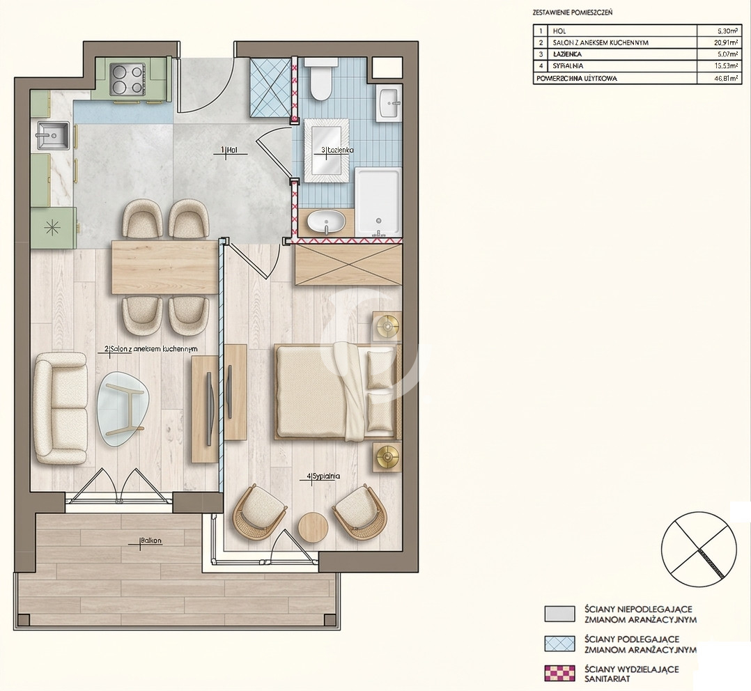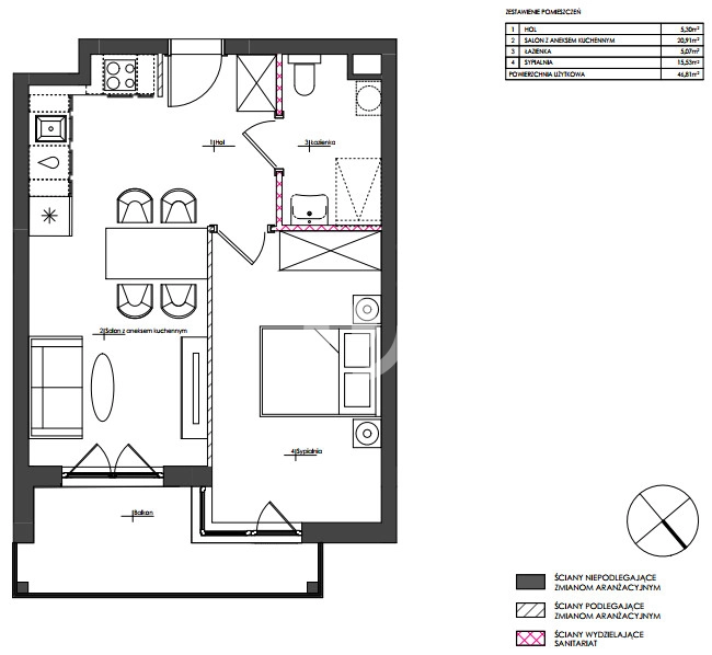 Cena całkowita: 548 176 zł (w tym obligatoryjne dodatki) Powierzchnia: 46,81 m² Liczba pokoi: 2 Piętro: 1