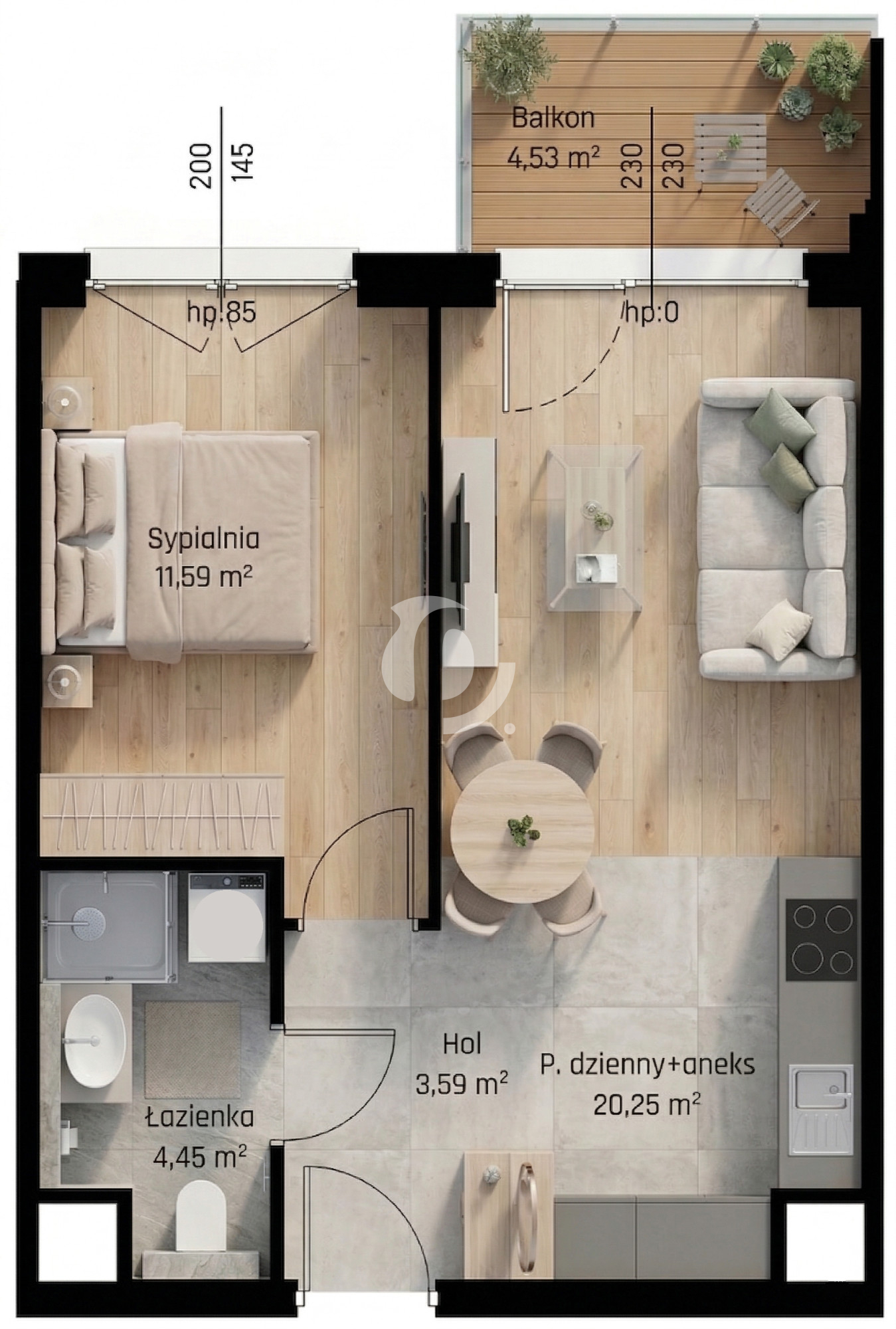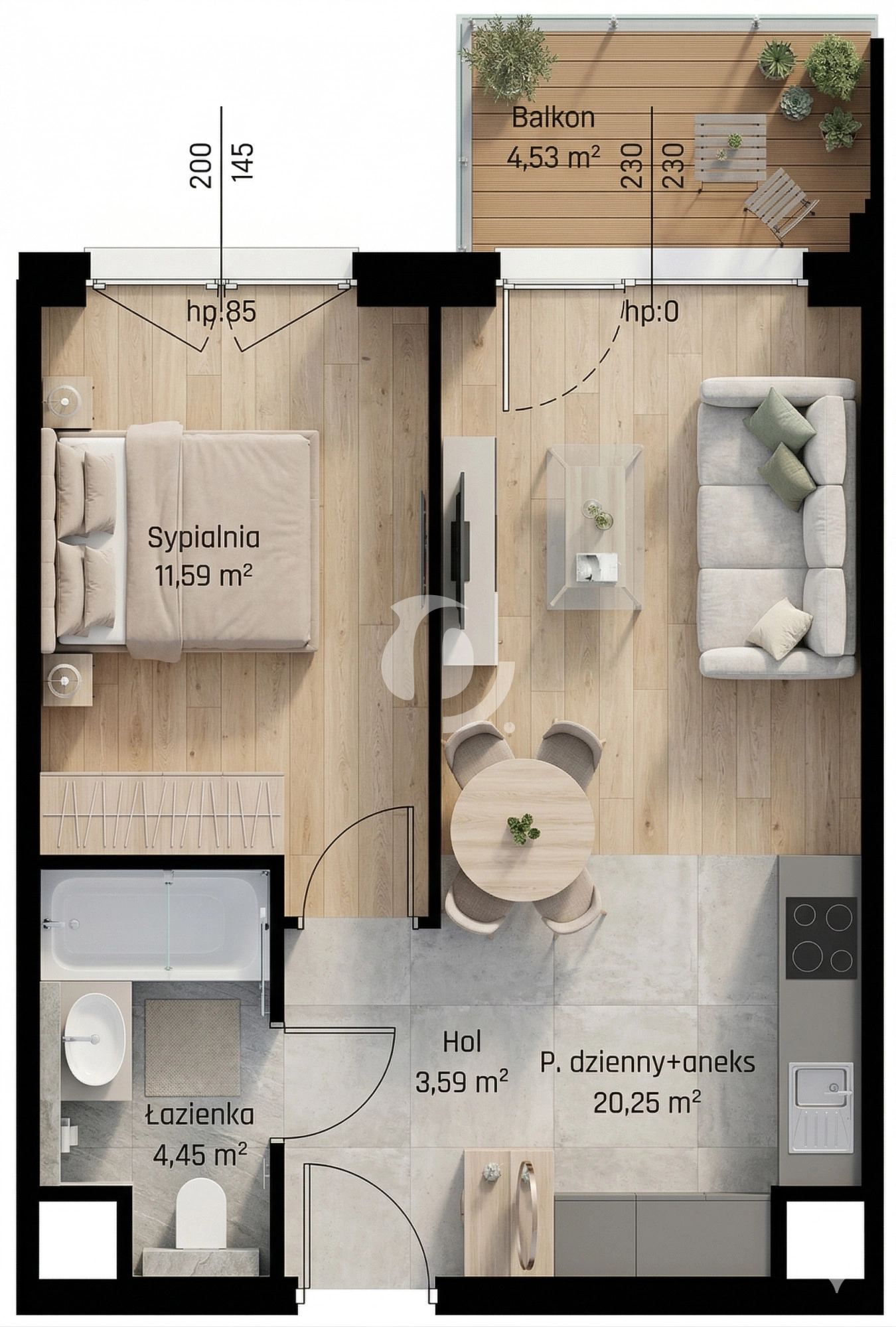 • Wygodna sypialnia o powierzchni 11,59 m².