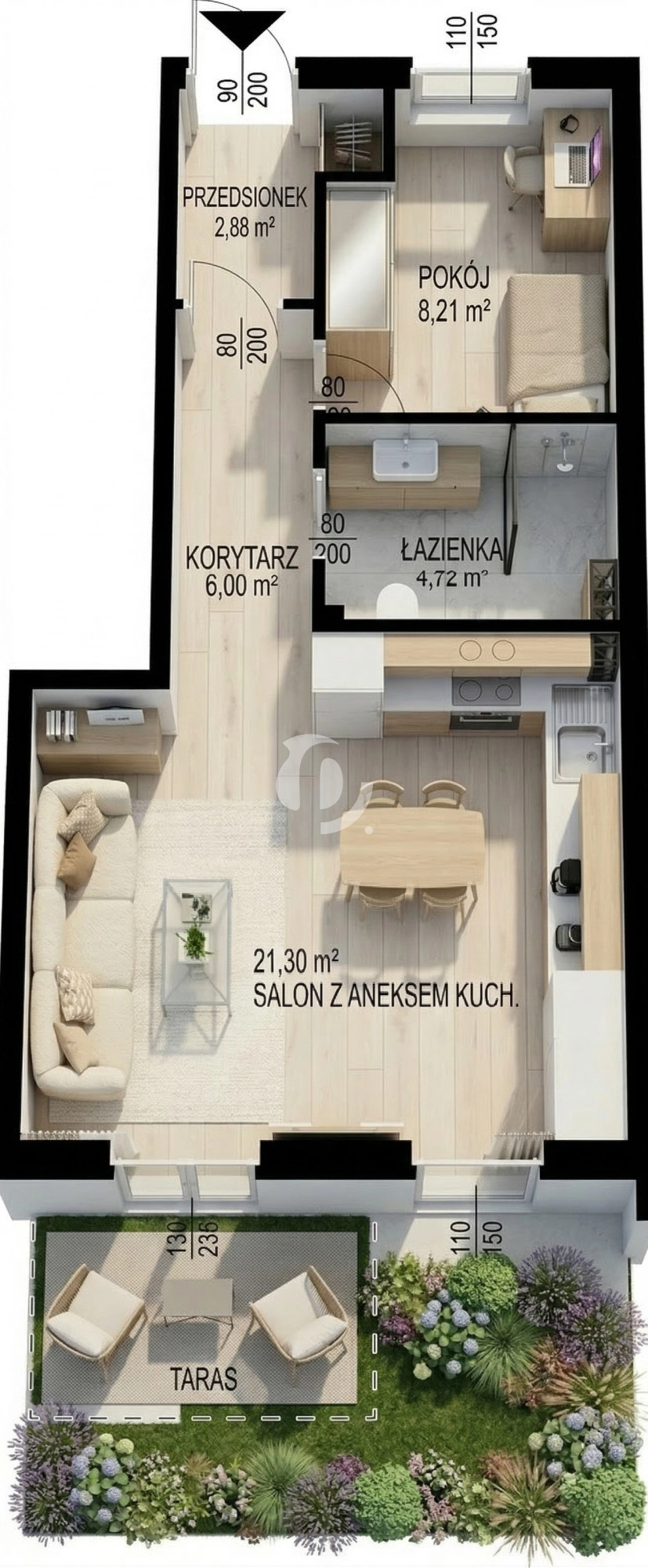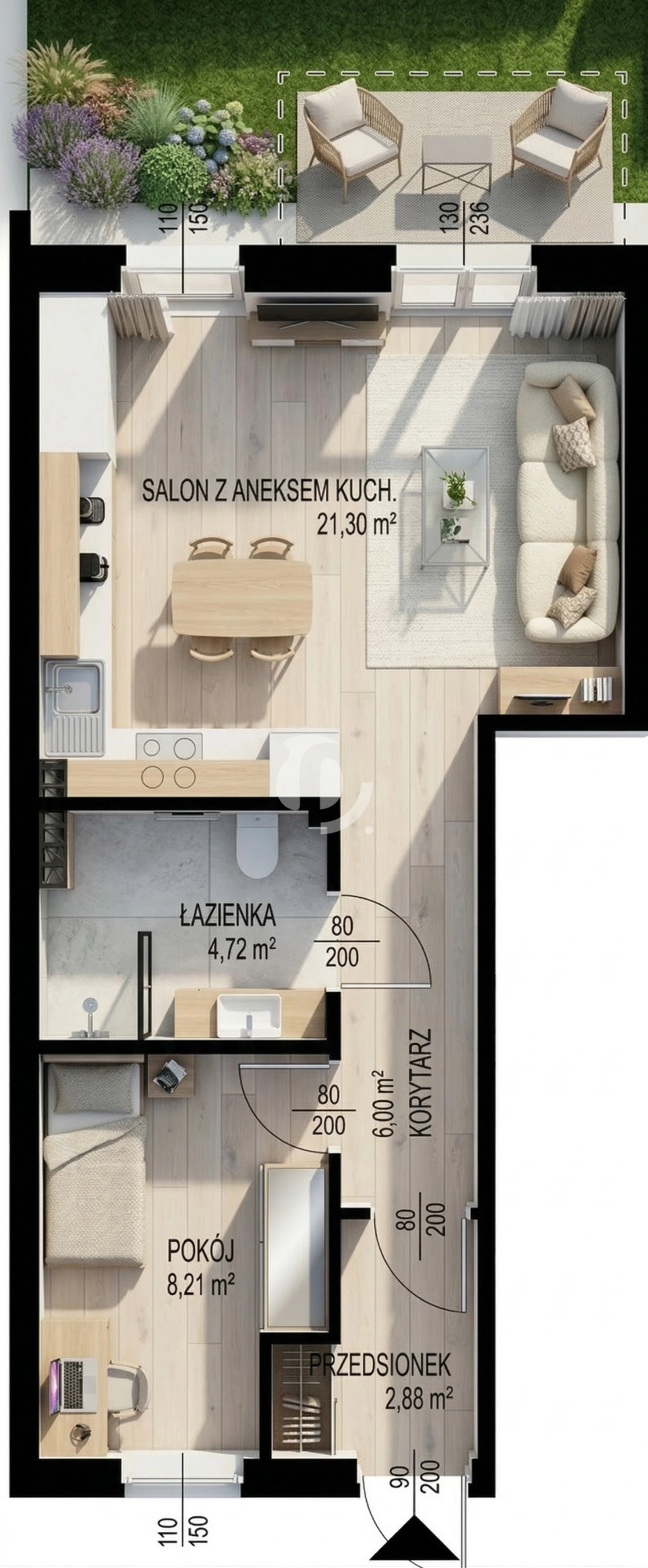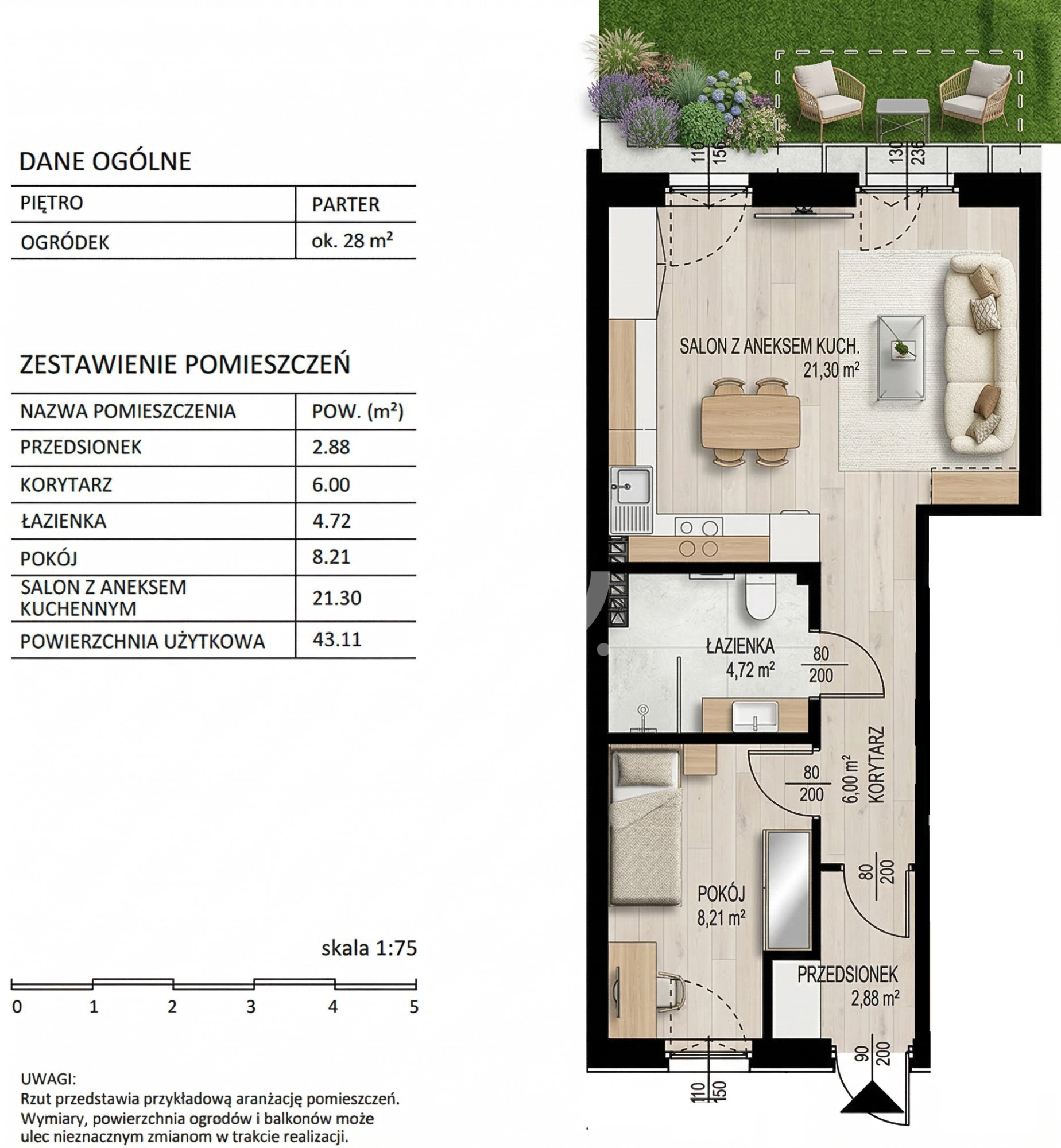 • Funkcjonalność i przestrzeń: Mieszkanie o powierzchni 43,11 m2 posiada przemyślany układ: jasny salon z aneksem kuchennym (21,30 m2), ustawny pokój/sypialnię (8,21 m2), korytarz oraz łazienkę.