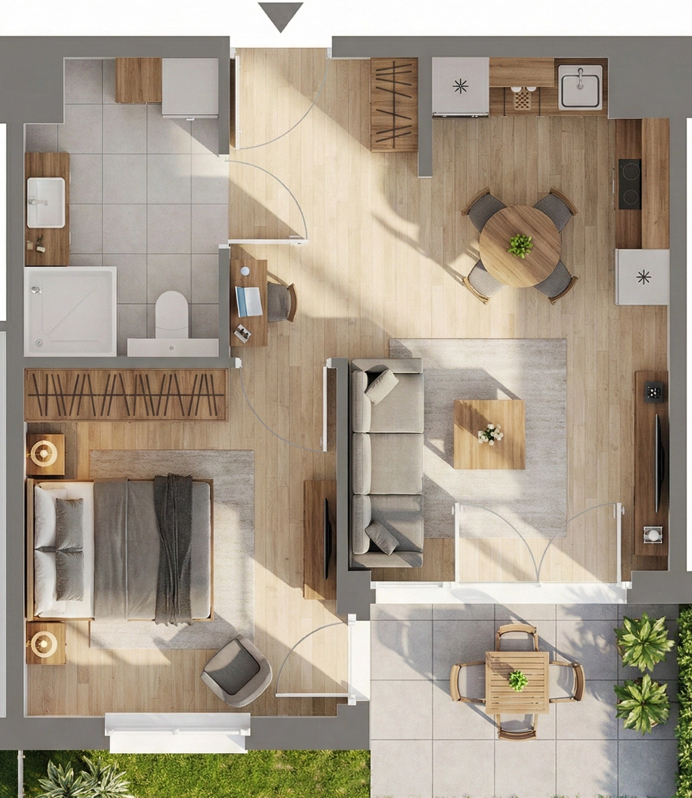 Przytulne, funkcjonalne mieszkanie 2 pokojowe zaprojektowane z myślą o komforcie codziennego życia. Jasny pokój dzienny z aneksem kuchennym i bezpośrednim wyjściem do ogródka tworzy naturalne przedłużenie strefy dziennej – idealne do relaksu i spotkań. Układ mieszkania jest ergonomiczny, z wyraźnym podziałem na część dzienną i sypialnianą.