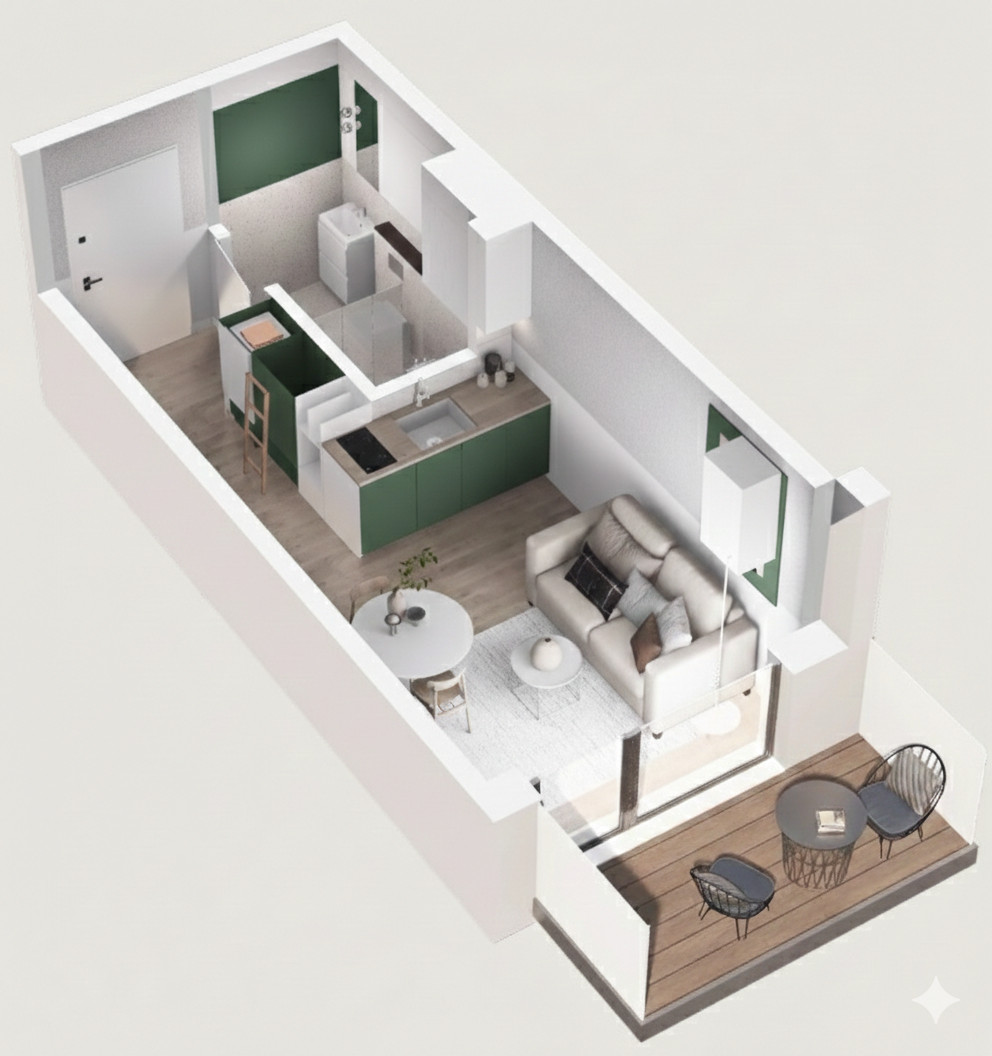 Dlaczego warto: gotowy produkt pod wynajem; bezobsługowy model (możliwość współpracy z operatorem najmu), szybkie uruchomienie przychodów, niski koszt wejścia i wysoka rotacja najemców dla kompaktowych lokali.
