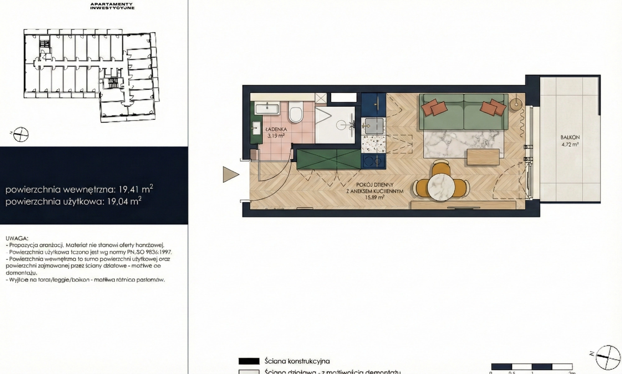 • Powierzchnia wewnętrzna: 19,41 m² (użytkowa 19,04 m²)