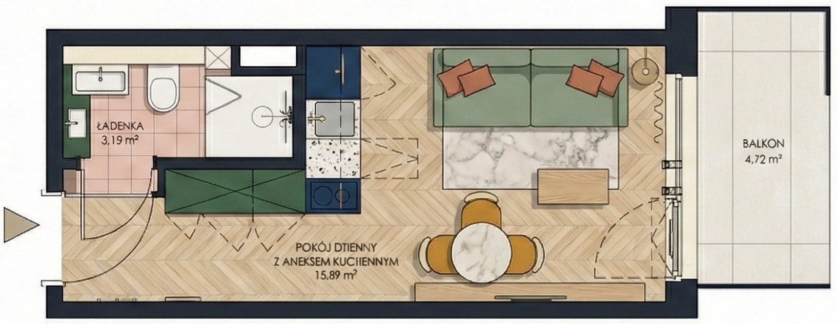 • Lokal: kawalerka (pokój dzienny z aneksem kuchennym)