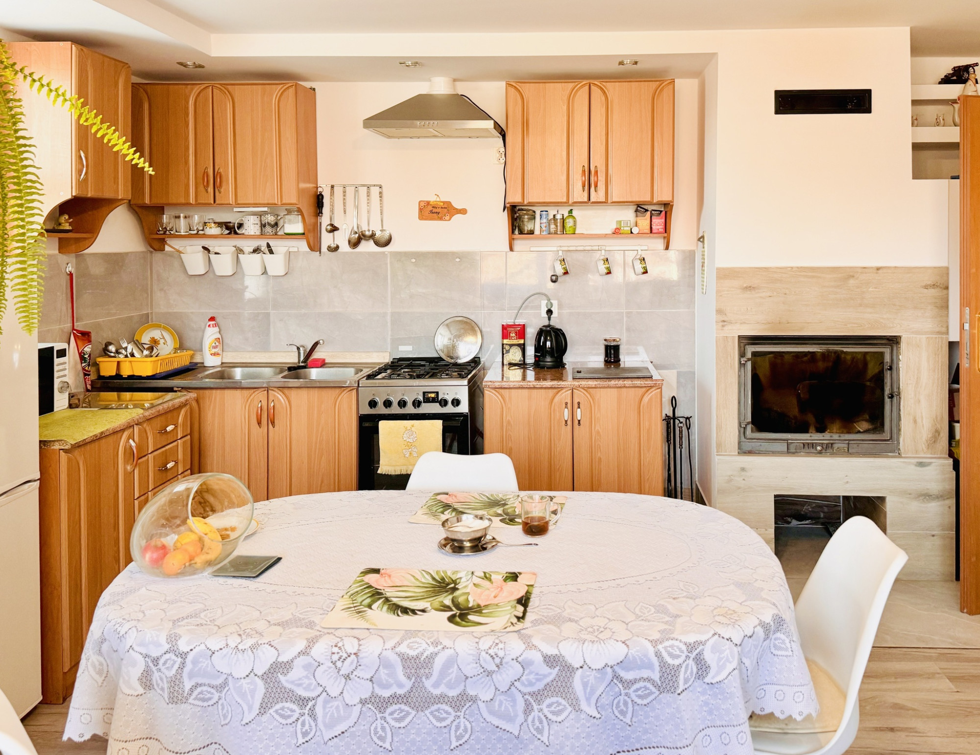 kuchnia połączona z salonem (z kolejnym kominkiem),
