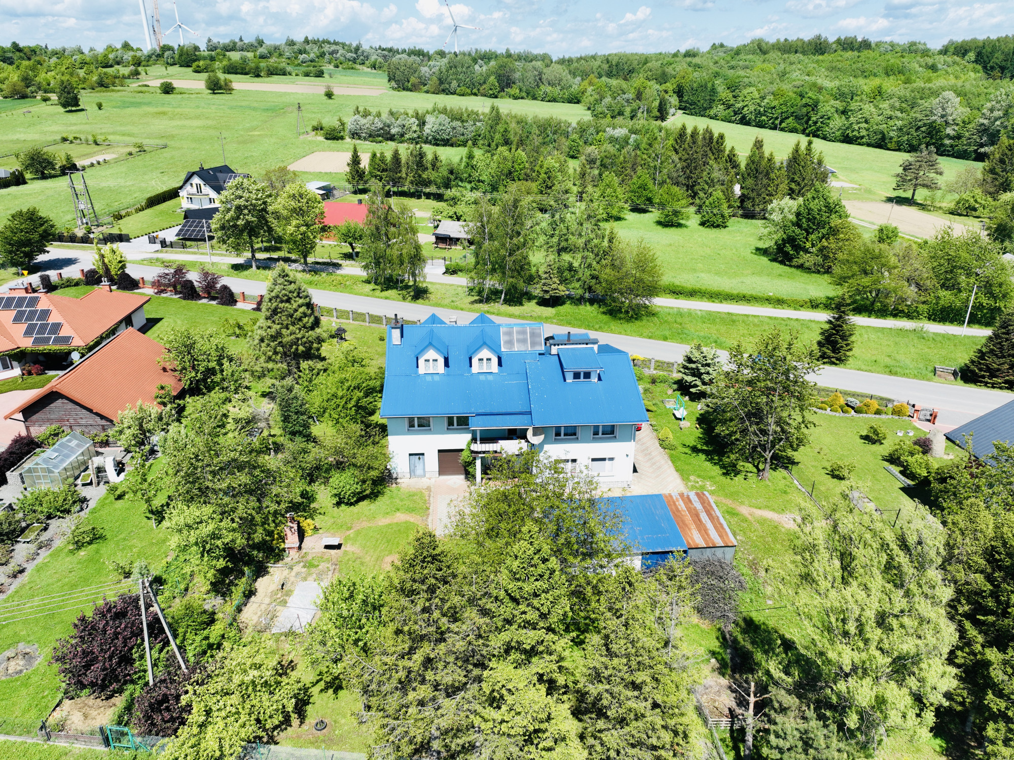 – Garaż – 58 m² + dodatkowe 3 blaszane garaże na działce, idealne do przechowywania lub prowadzenia warsztatu.