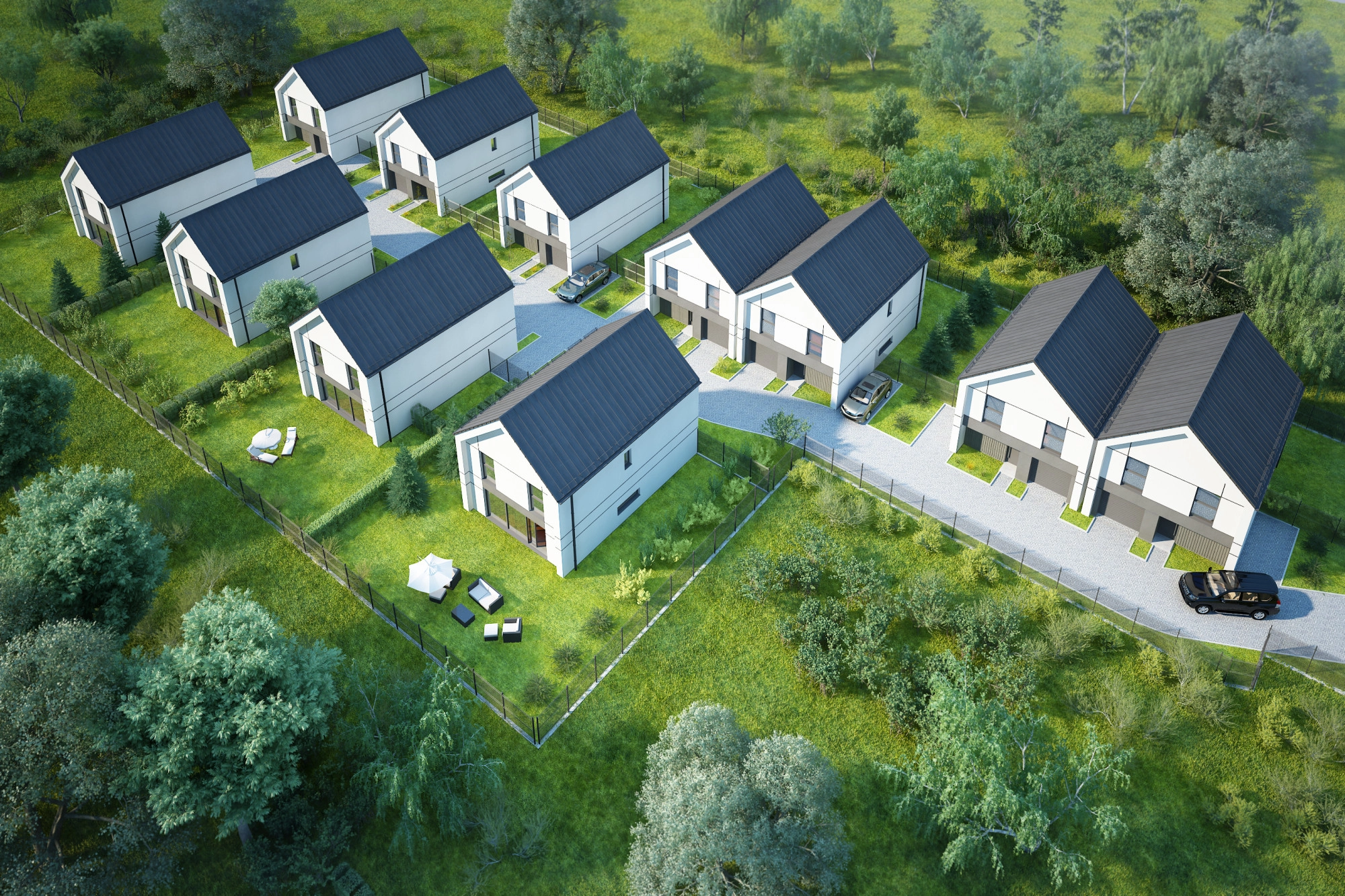 Cała inwestycja ogrodzona, z osobnym wjazdem z asfaltowej drogi