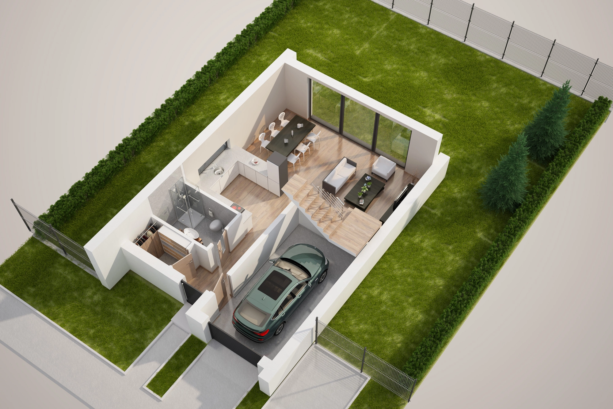 Dom znajduje się na kameralnym, nowo budowanym osiedlu domów jednorodzinnych w zielonej części Krakowa – Grębałów.