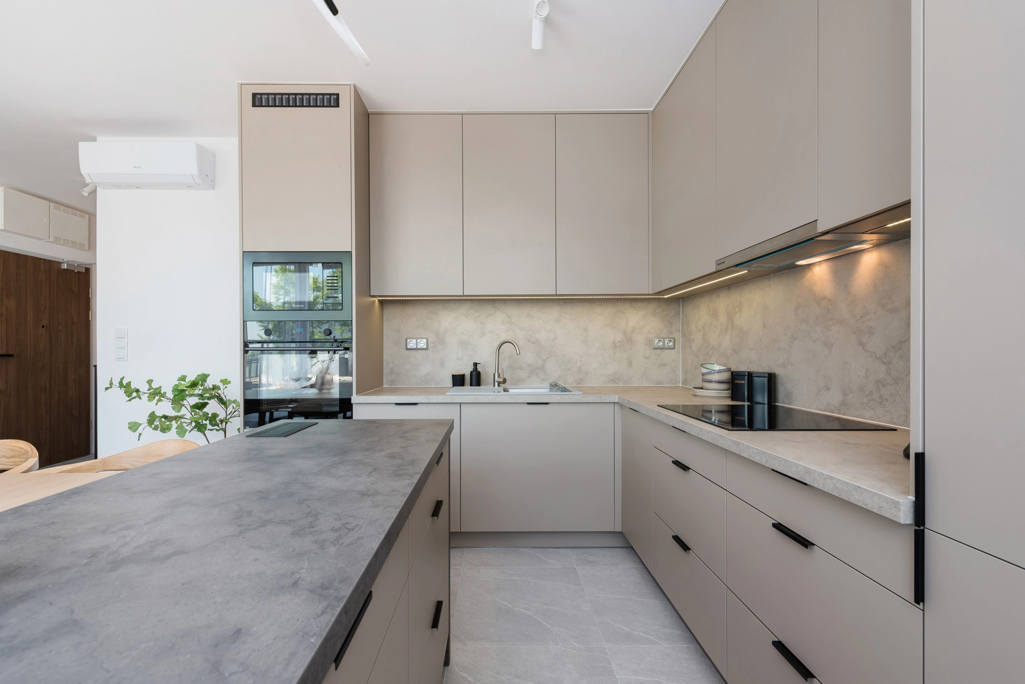 Meble kuchenne, łazienkowe i szafy w przedpokoju wykonane na wymiar przez stolarza.