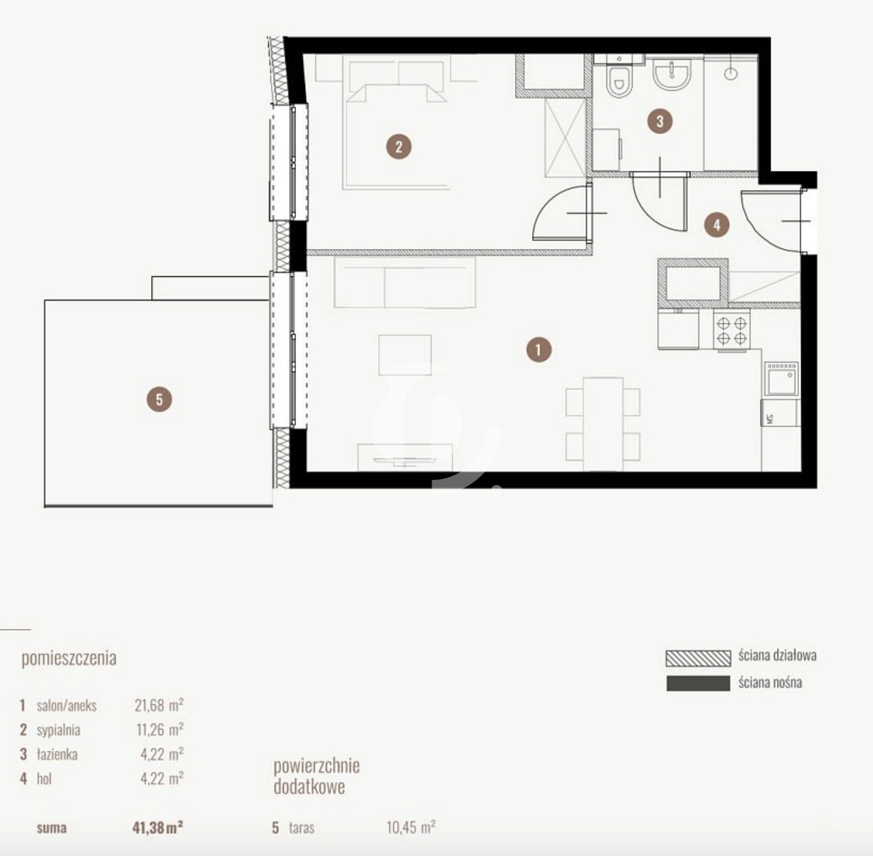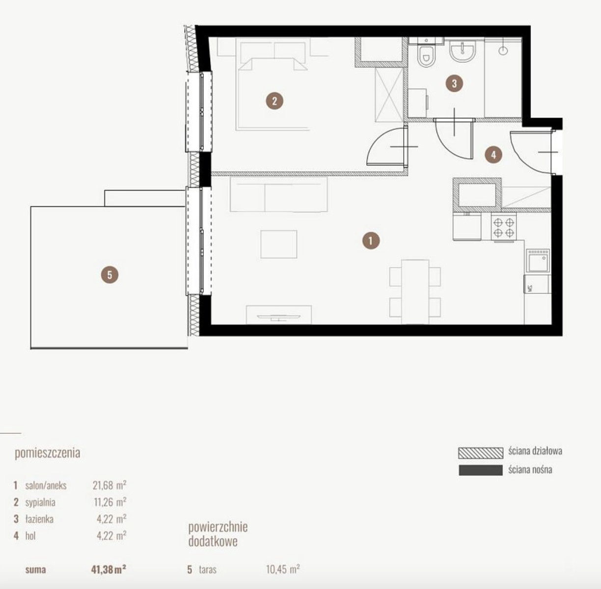 Układ mieszkania zapewnia maksymalne wykorzystanie przestrzeni i doskonałe doświetlenie wnętrza.