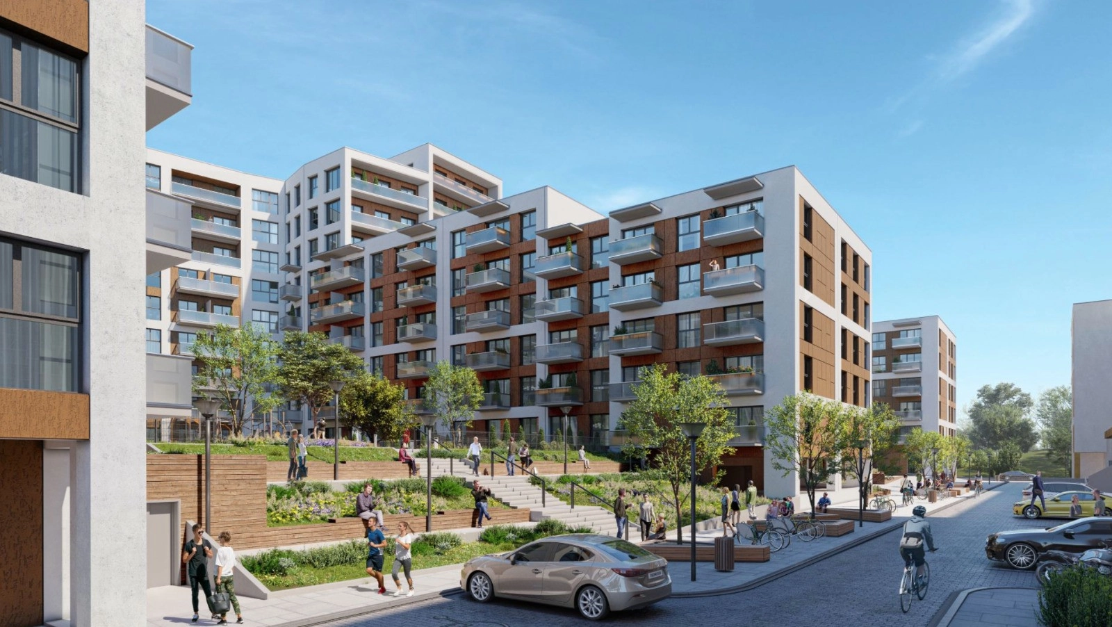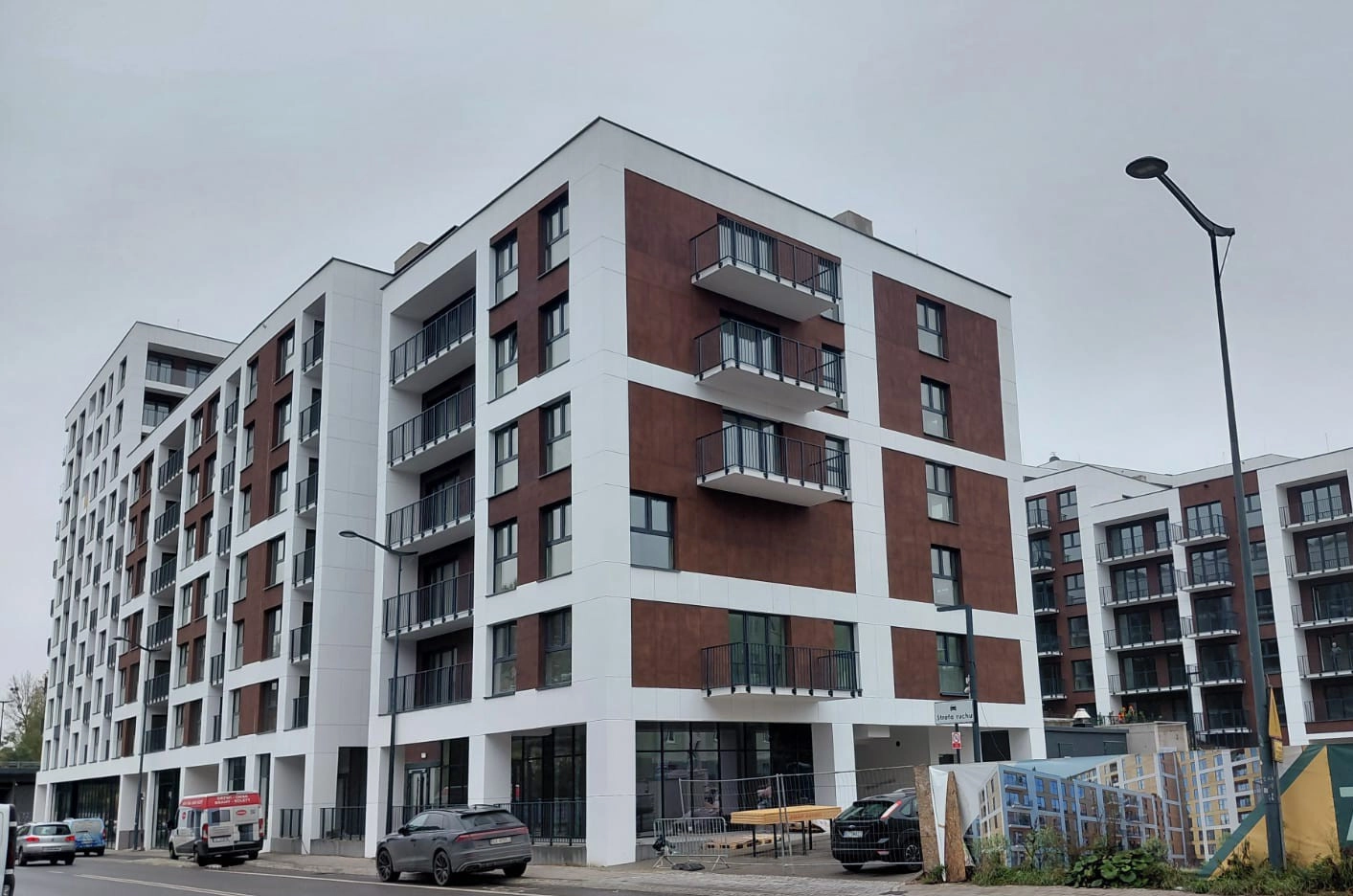 W dwóch budynkach o kaskadowej zabudowie powstało blisko 600 mieszkań o powierzchni od 26 do 75 m² (1-4 pokoje).