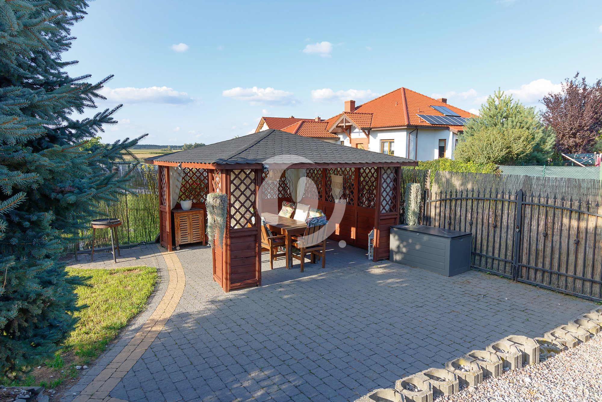 Na zagospodarowanej działce znajduje się taras, altana grilowa oraz wolnostojący garaż w lekkiej konstrukcji, aktualnie pełniący funkcję magazynową.