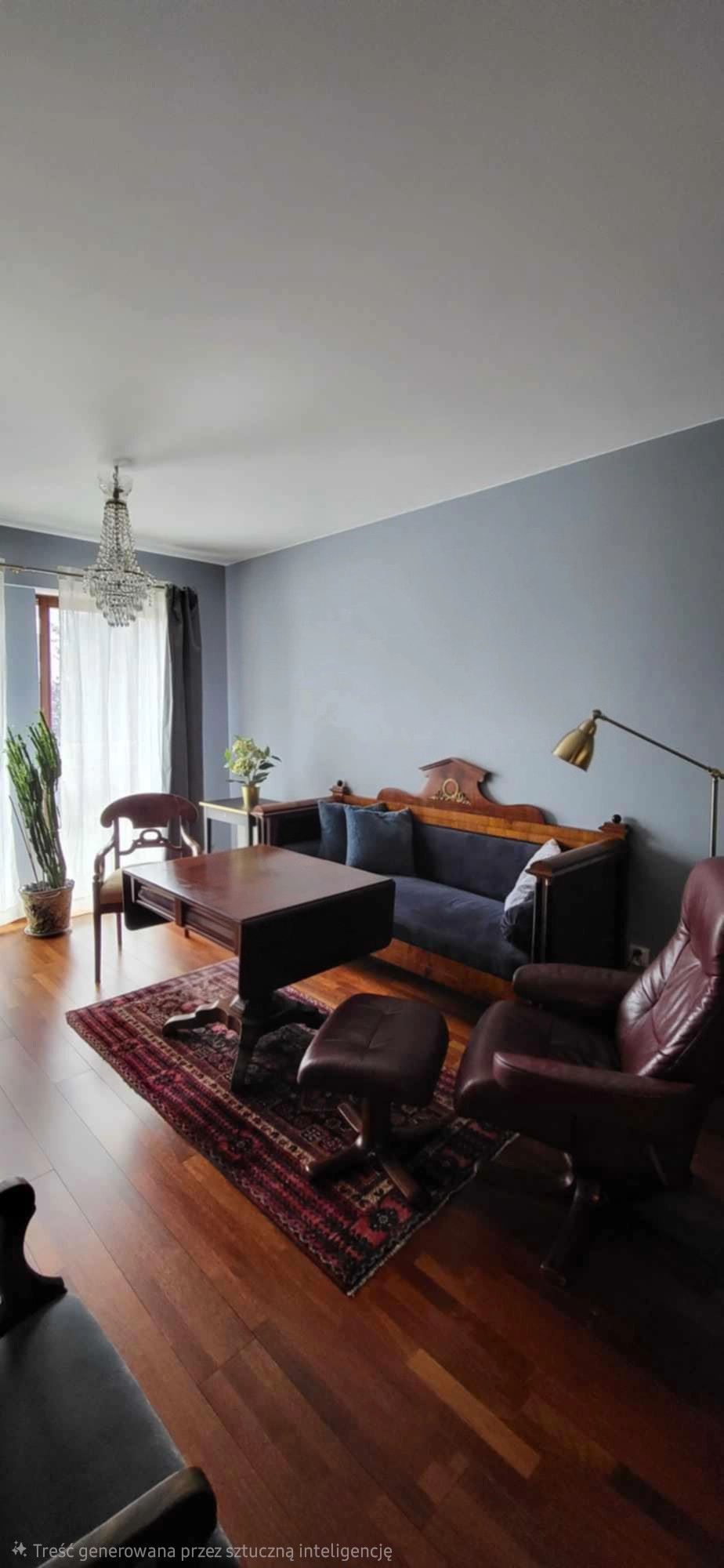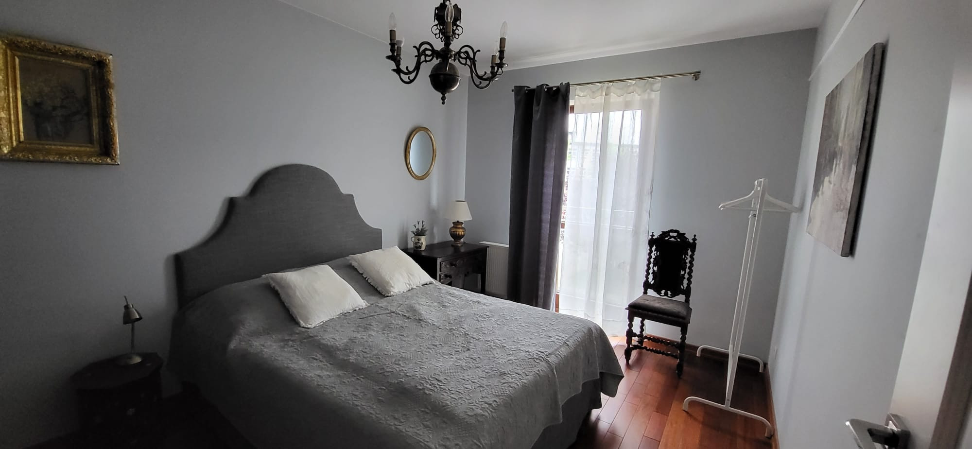 Mieszkanie wyróżnia się eklektycznym stylem, łączącym nowoczesne standardy wykończenia (jasne podłogi, nowoczesne zabudowy kuchenne i łazienkowe) z unikatowymi, antycznymi meblami.