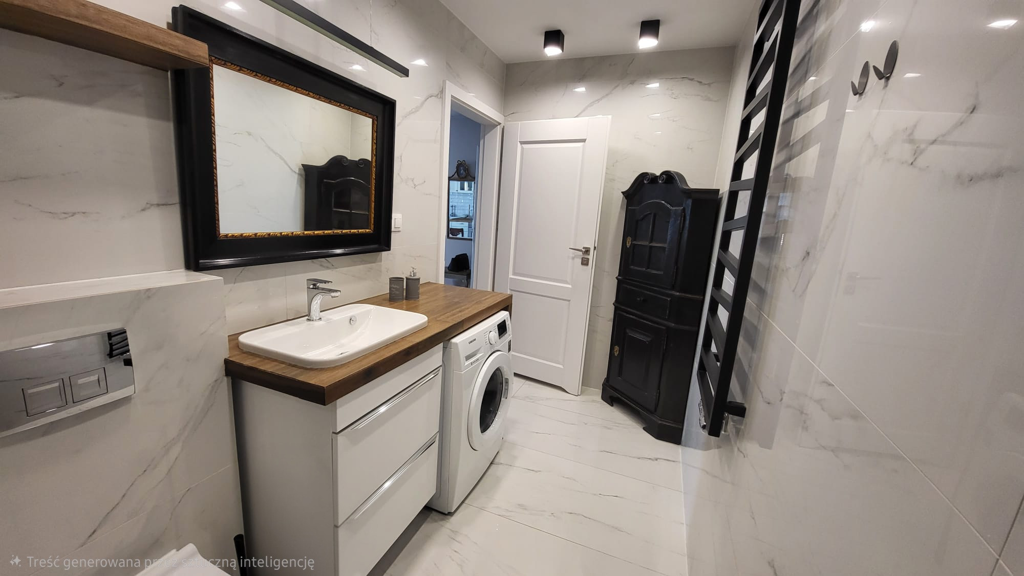 • Łazienka: 5,90 m² – wykończona w jasnych płytkach imitujących marmur, z nowoczesną armaturą, drewnianym blatem pod umywalkę oraz pralką.