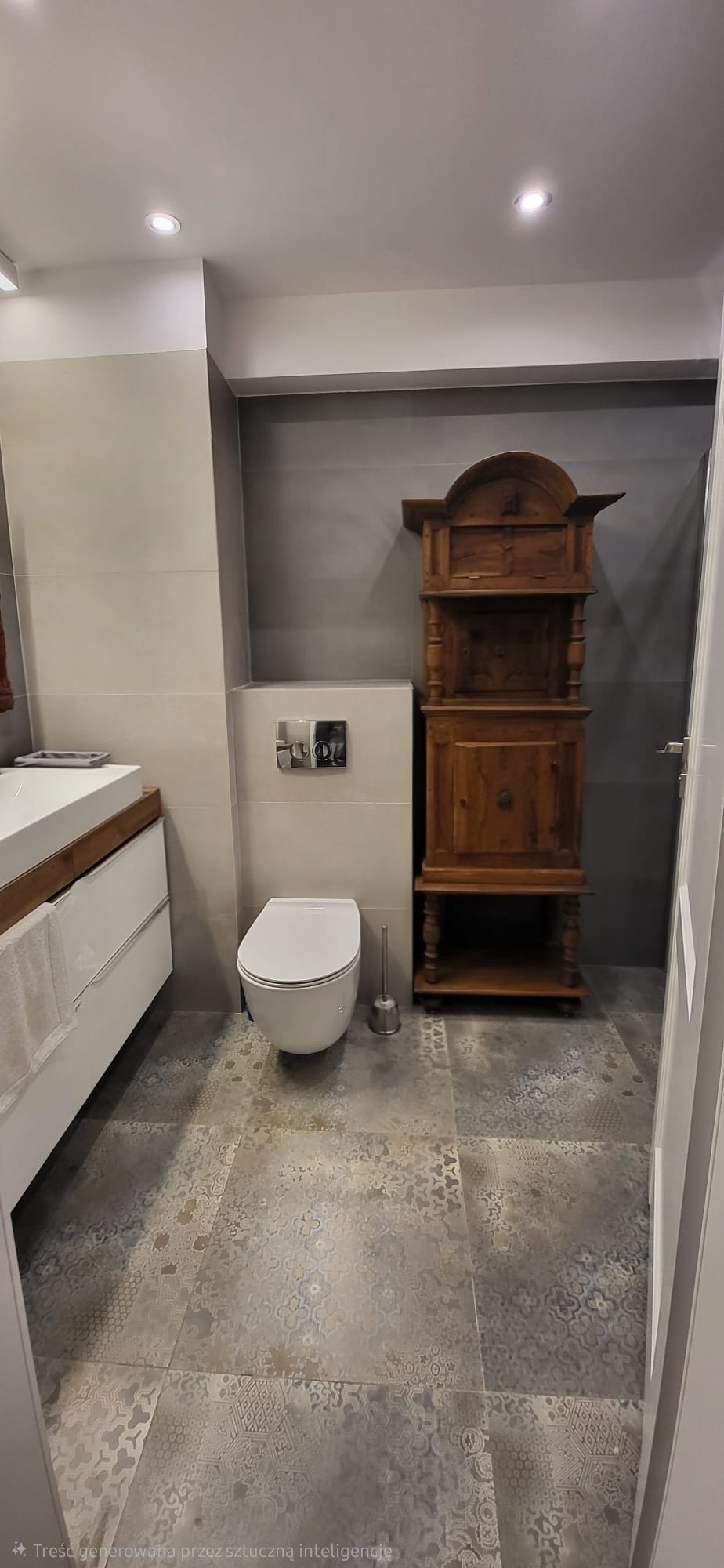 • Toaleta: 1,77 m² – utrzymana w podobnej stylistyce co łazienka, z dodatkowym elementem w postaci stylowej, drewnianej szafki.