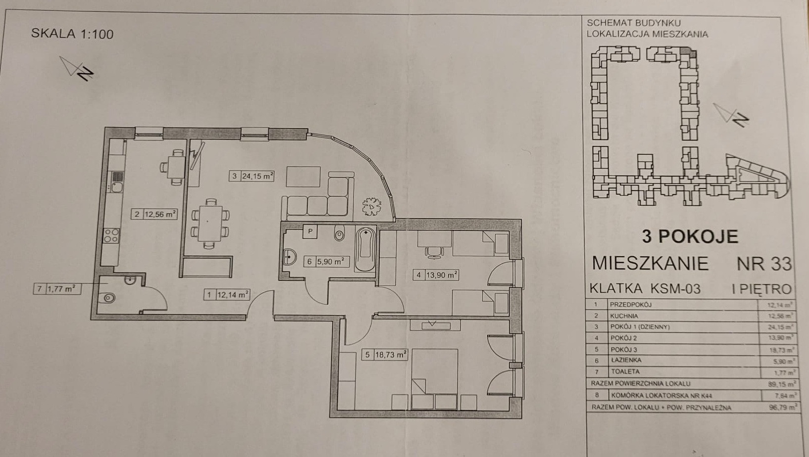 Łączna powierzchnia użytkowa lokalu wynosi 89,15 m², a wraz z przynależną komórką lokatorską (7,64 m²) – 96,79 m².