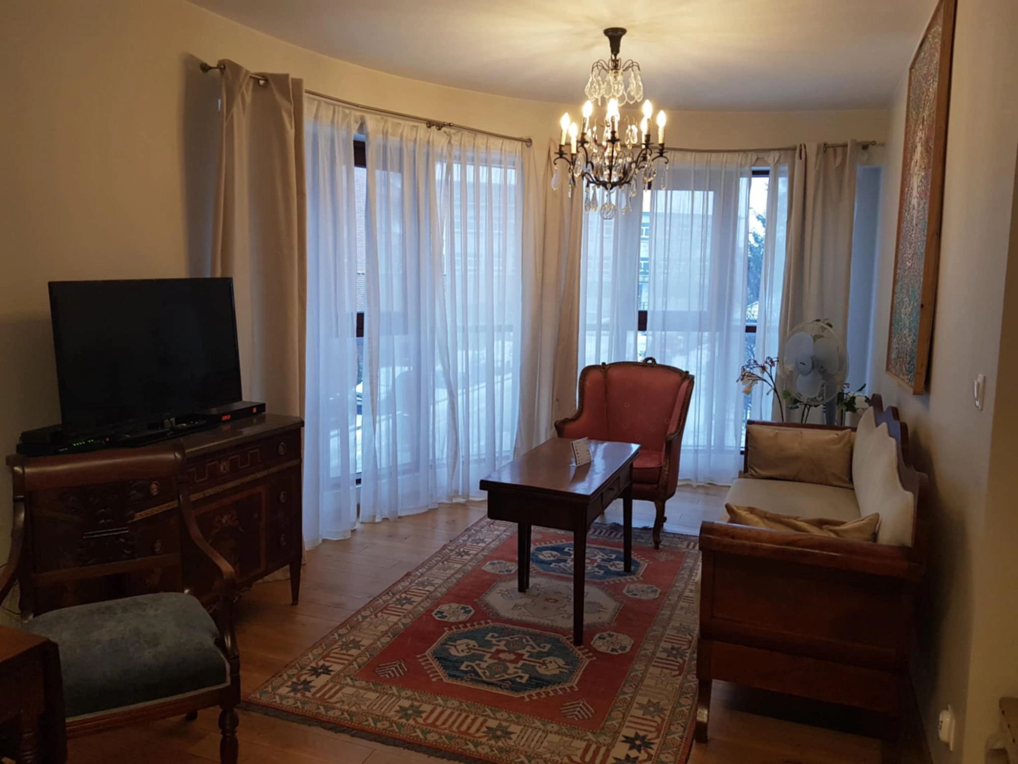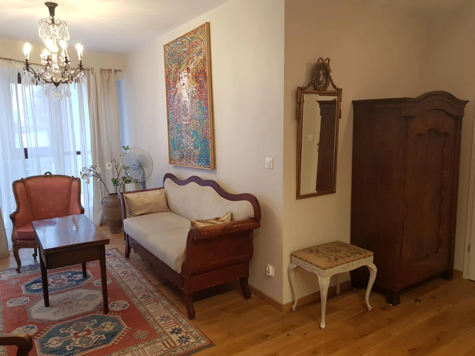 • Pokój dzienny (Salon): 24,15 m² – najbardziej przestronne pomieszczenie z dużymi przeszkleniami prowadzącymi na balkon. Wnętrze charakteryzuje się bogatym, klasycznym wystrojem z wykorzystaniem antycznych mebli, ozdobnych żyrandoli i obrazów.