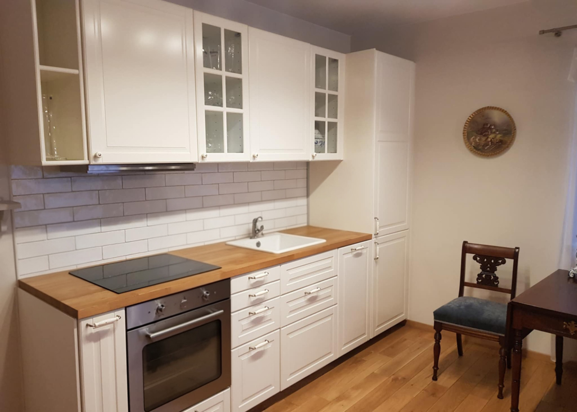 • Kuchnia: 12,56 m² – urządzona w nowoczesnym stylu z białymi frontami szafek, drewnianym blatem i klasycznymi akcentami w postaci antycznych krzeseł i stołu.