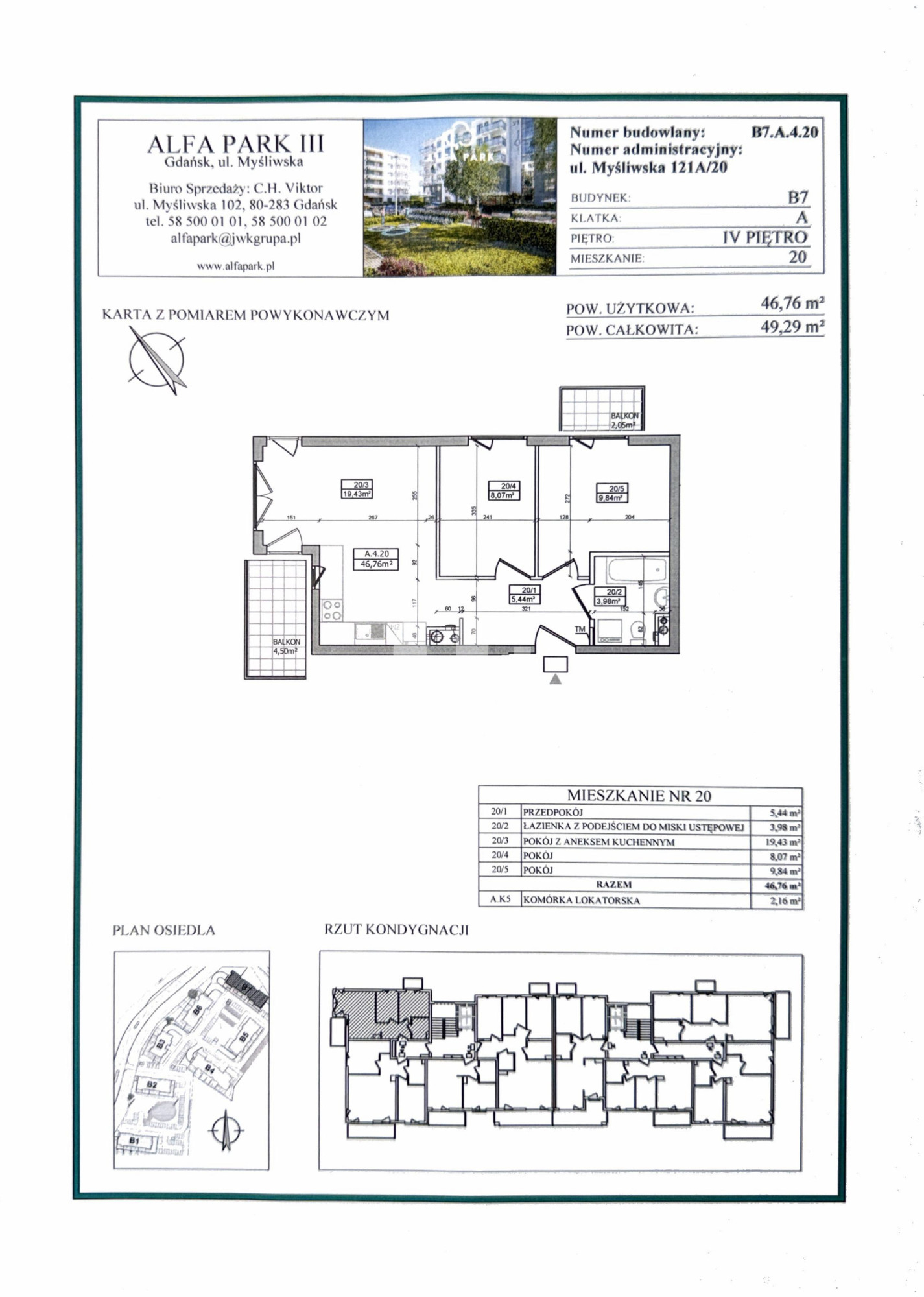 Na sprzedaż jasne i funkcjonalne mieszkanie o powierzchni 46,50 m², położone na 4 piętrze w 5-piętrowym budynku z nowego budownictwa przy ul. Myśliwskiej w dzielnicy Gdańsk – Jasień. Osiedle Alfa Park 3.