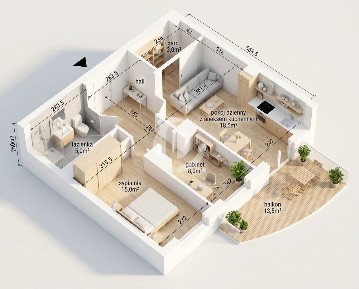 – 2 pokoje na komfortowym metrażu 58,73m2 (pokój dzienny 18,5m2, sypialnia 15m2)